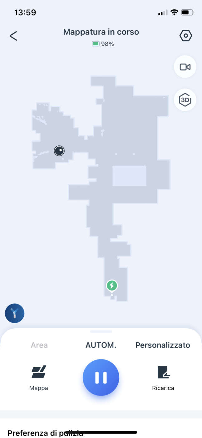 La prima presa di contatto con l’ambiente richiede pochi minuti, dopodiché il robot costruisce una mappa iniziale della casa che verrà poi aggiornata e integrata a ogni pulizia, ad esempio per individuare eventuali ostacoli che rimangono sempre fermi nella stessa posizione o viceversa elementi che vengono spostati da una pulizia all’altra (come, per esempio, le sedie o eventuali ostacoli temporanei). L’app consente di specificare la tipologia di ogni stanza, per poi indirizzare direttamente i vari ambienti per eventuali sessioni di pulizia specifiche. La funzione di mappatura si è dimostrata abbastanza accurata (con un paio di piccoli errori senza ripercussioni pratiche sul movimento del robot), ed è disponibile una doppia modalità di visualizzazione: oltre alla classica pianta 2D, infatti, si può aprire anche una accattivante vista tridimensionale, che consente anche di collocare elementi d’arredo.