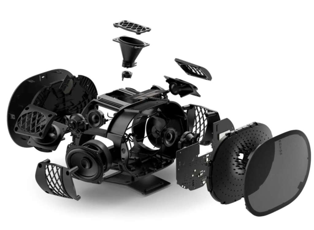Disponibile nella colorazione bianca o nera per meglio adattarsi all’arredamento, l’Era 300 si presenta come un ovale sinuoso di plastica largo 26 centimetri, ove lo spazio dedicato all’emissione sonora occupa buona parte della sua superficie visibile: monta ben sei driver, ognuno accompagnato da un suo amplificatore digitale di classe D; quattro sono i tweeter, uno frontale, uno indirizzato verso il soffitto per meglio creare audio avvolgente, e due ai lati dedicati all’immagine stereo. A questi si aggiungono due woofer laterali, distanziati internamente in modo da evitare vibrazioni dannose e pensati per aprire al meglio la stereofonia. Il suono infine esce attraverso guide d’onda progettate per dare il meglio nell’audio spaziale.