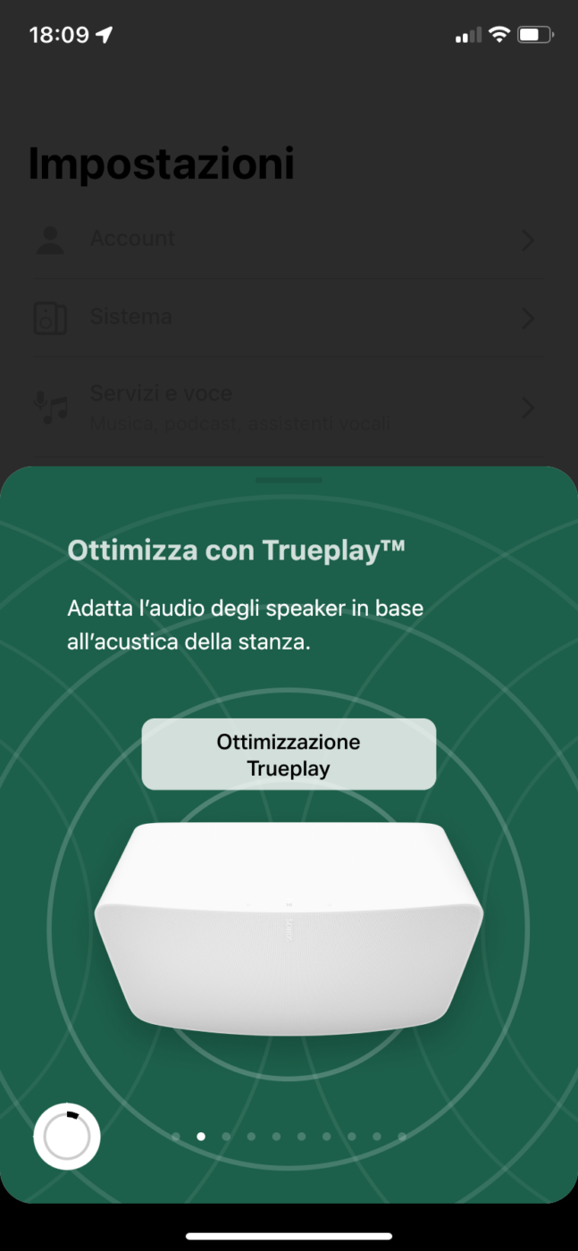 Nell’app troviamo inoltre le varie opzioni di configurazione, compresa la funzionalità Trueplay: questa è in grado di analizzare la risposta acustica della stanza dove è posizionato lo speaker e impostarne le equalizzazioni di conseguenza. Con la configurazione base, l’analisi non richiede esperienza per l’ascoltatore: il Sonos si mette a trasmettere inpulsi nelle varie direzioni e i suoi microfoni ne captano l’onda di ritorno; l’unica cautela richiesta consiste nel mantenere il silenzio nei pochi secondi richiesti alla procedura. Gli utenti iOS (ma non quelli con Android) hanno a disposizione anche la modalità avanzata che fa uso del microfono dello smartphone per rilevare la posizione dell’ascoltatore: abbiamo trovato comunque quella automatica sufficientemente precisa in tutti gli ambienti dove abbiamo effettuato le nostre prove d’ascolto, da non necessitare di utilizzare l’impostazione avanzata.