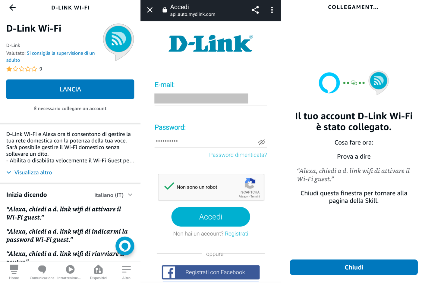 Per Alexa bisogna scaricare la skill D-Link Wi-Fi, collegare l’account D-Link a quello di Amazon e consentire la visualizzazione e l’accesso ai dispositivi da parte di Alexa.