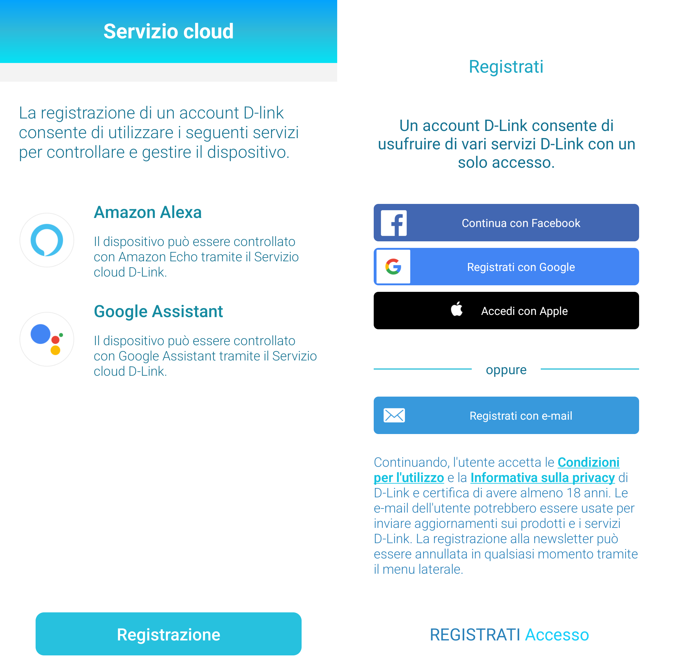 In entrambi i casi è necessario accedere alle impostazioni della app (ingranaggio in alto a destra), cliccare su Servizio Cloud, poi su Alexa/Google e creare un account D-Link (o accedere se già esistente).