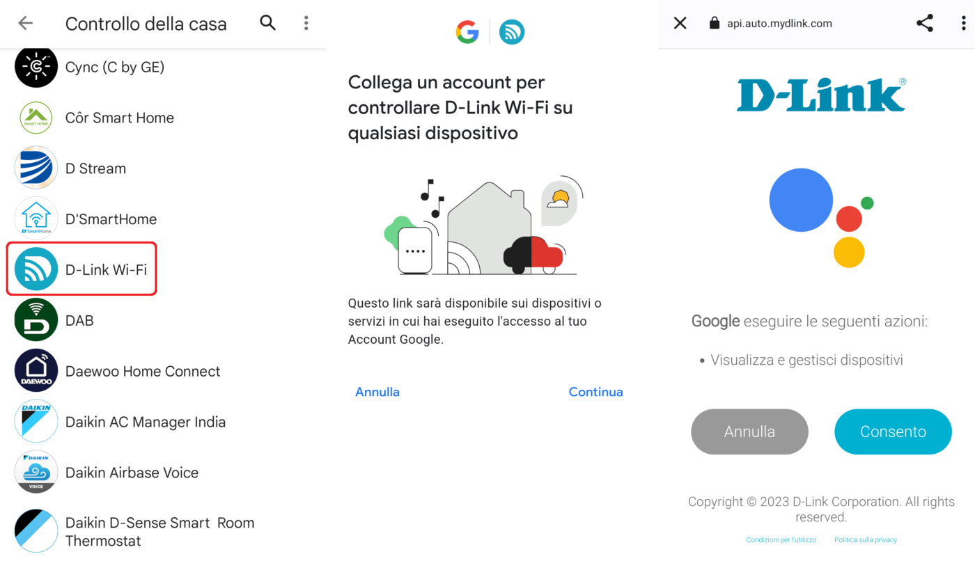 Stesso discorso e identici comandi per Google Assistant ma senza bisogno di scaricare alcuna skill: basta configurare un nuovo dispositivo, selezionare dall’elenco “D-Link Wi-Fi” e collegare gli account per consentire a Google di gestire i COVR con la voce (es.: “OK Google, chiedi a D-Link Wi-Fi di abilitare/disabilitare il wi-fi guest”).