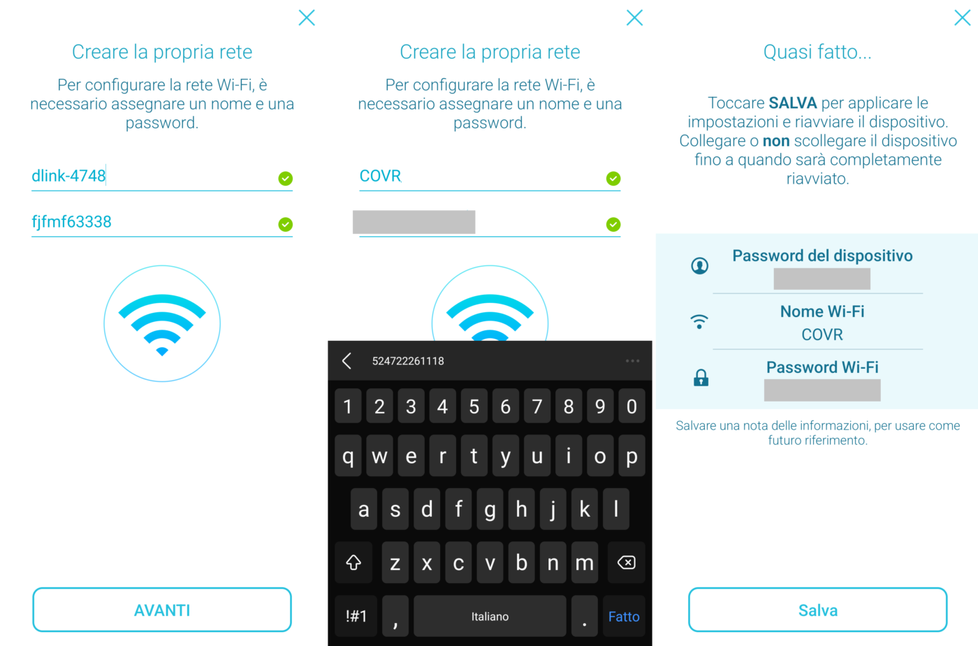 Selezionare sullo smartphone la rete Wi-Fi riportata nella schermata (es.: dlink-4748), digitare la password indicata, ritornare alla app D-Link Wi-Fi, cliccare su Avanti, attendere il collegamento e, se necessario, personalizzare SSID e password.