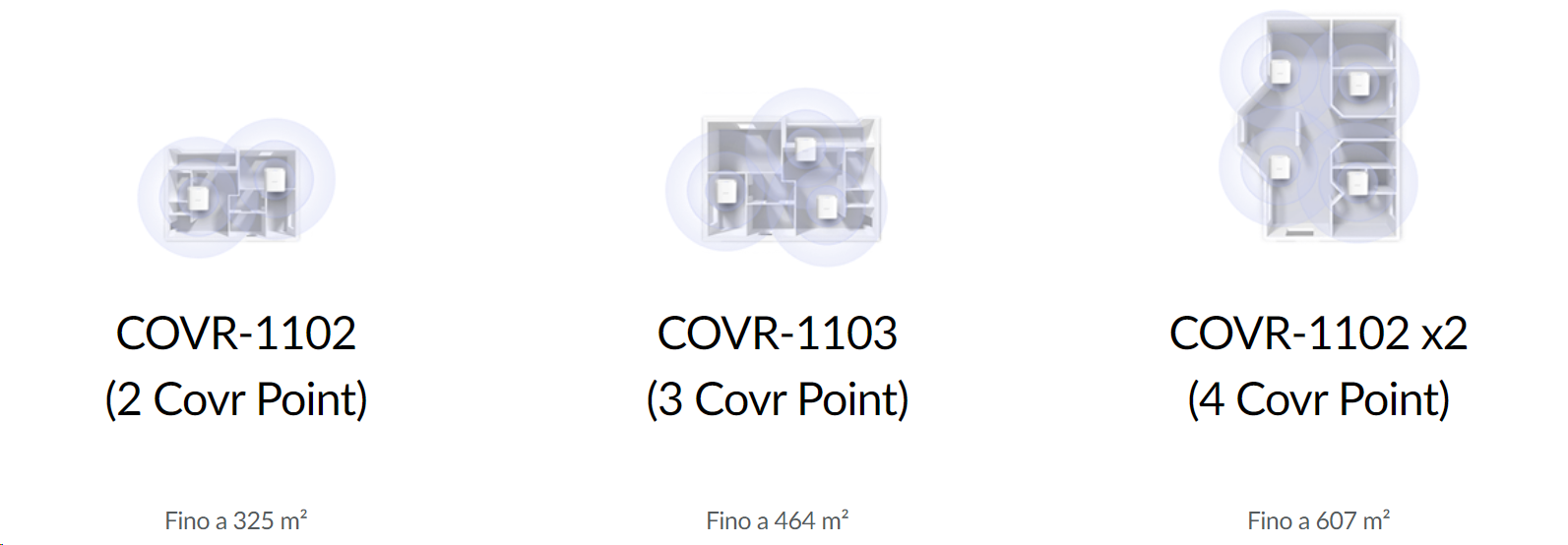 La famiglia COVR 110x comprende tre kit identificati da un numero: 1102 (composto da due moduli COVR-1110), 1103 (tre moduli) e 1102 x2 (quattro moduli). In molte abitazioni “standard” è sufficiente utilizzare il kit 1102 (che copre fino a 325 mq), per quelle più grandi serve il 1103 (massimo 464 mq) mentre per soluzioni multi-piano D-Link consiglia il 1102 x2 (fino a 607 mq).