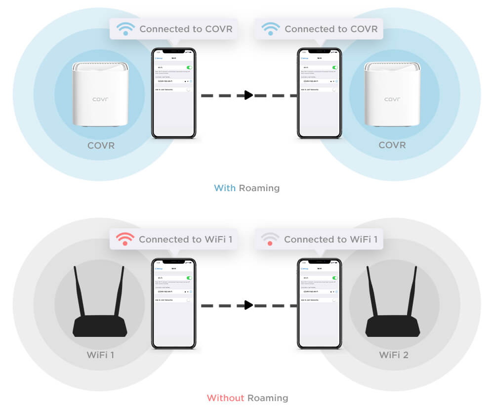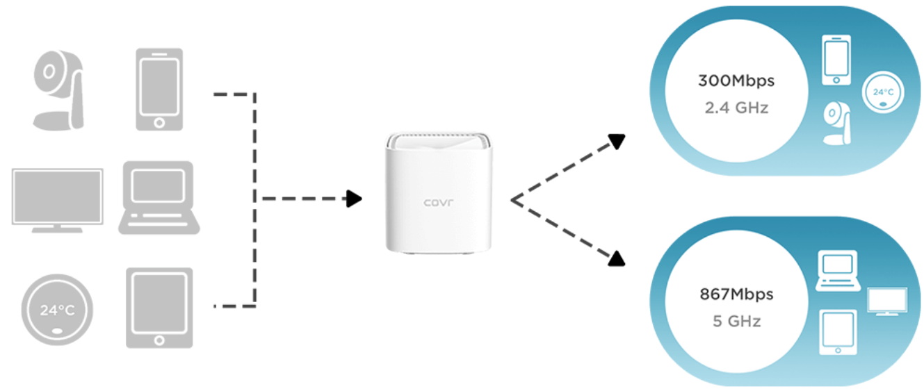 Ogni singolo modulo COVR-110x può fungere da “ricevitore” e da “trasmettitore” per creare una rete di comunicazione Wi-Fi estesa e intelligente, una “bolla” dove il segnale wireless si mantiene forte e stabile per garantire la massima velocità supportata dai dispositivi (smartphone, tablet, Smart Tv, dispositivi domotici Wi-Fi, ecc.) e dal modem/router di casa.