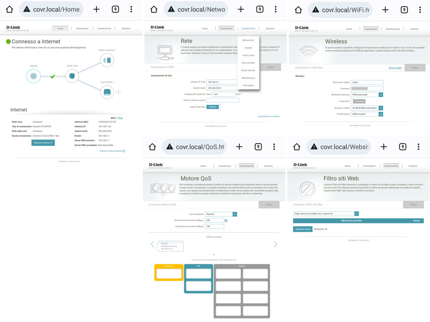In alternativa alla app è possibile gestire il sistema COVR 110x dall’interfaccia web: basta aprire un qualsiasi browser (Chrome, Edge, ecc.) su PC, smartphone o altro dispositivo connesso alla rete Wi-Fi generata dai COVR e digitare l’indirizzo https://covr.local/ per accedere ai menu di configurazione con molte più funzioni e opzioni (motore QoS, firewall, inoltro porte, filtro siti web, route statici, DNS dinamico, VPN, statistiche, ecc.).