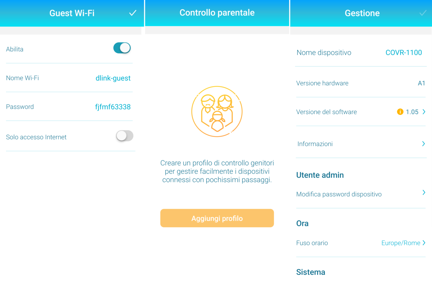 La app D-Link Wi-Fi permette di gestire le funzionalità e i settaggi del sistema COVR come il Parental Control (pianificazione orari on/off, profili, ecc.), l’aggiornamento firmware automatico (con tanto di notifica push), l’abilitazione della rete wireless dedicata agli ospiti (con eventuale isolamento LAN per impedire l’accesso ai contenuti condivisi in rete – es.: NAS), l’integrazione con Alexa e Google, lo stato del sistema (COVR attivi, connessione a internet, ecc.), la sicurezza (legacy WPA/WPA2, WPA2 oppure WPA3) e molto altro.
