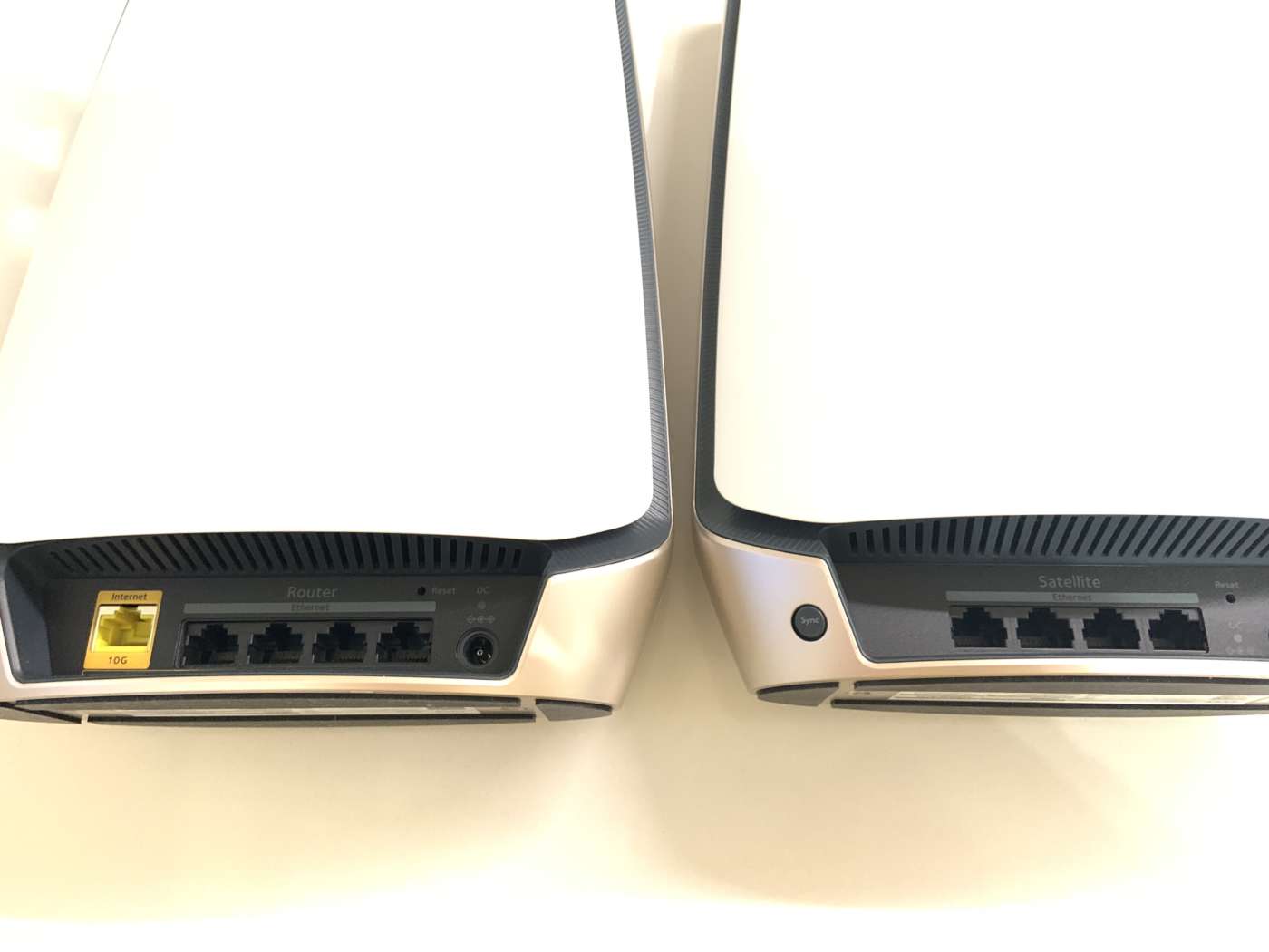 I tre componenti sono esteticamente molto simili: si presentano come monoliti bianchi alti 25 cm, larghi 20 e profondi 7; il router si differenzia per la presenza di alcuni adesivi con le password per la prima configurazione, che potranno poi essere rimossi, e della porta WAN posteriore di colore giallo pensata per collegarlo al modem principale. Essendo dei componenti pensati per essere lasciati in bella vista in ambiente domestico si nota l’attenzione al design e alla piacevolezza del prodotto in generale, la satinatura del corpo principale e le linee sinuose caratterizzano sia il corpo principale che i satelliti, l’effetto finale è di perfetta integrazione con gli arredi interni. La porta WAN è capace di trasferire dati fino a 10 Gigabit/sec, potendo così gestire al meglio le più recenti e veloci installazioni in fibra ottica. Il kit da noi provato ha come colore dominante il bianco con satinatura acciaio ma ne esiste anche una versione nera, la cui unica differenza riscontrata è il colore.