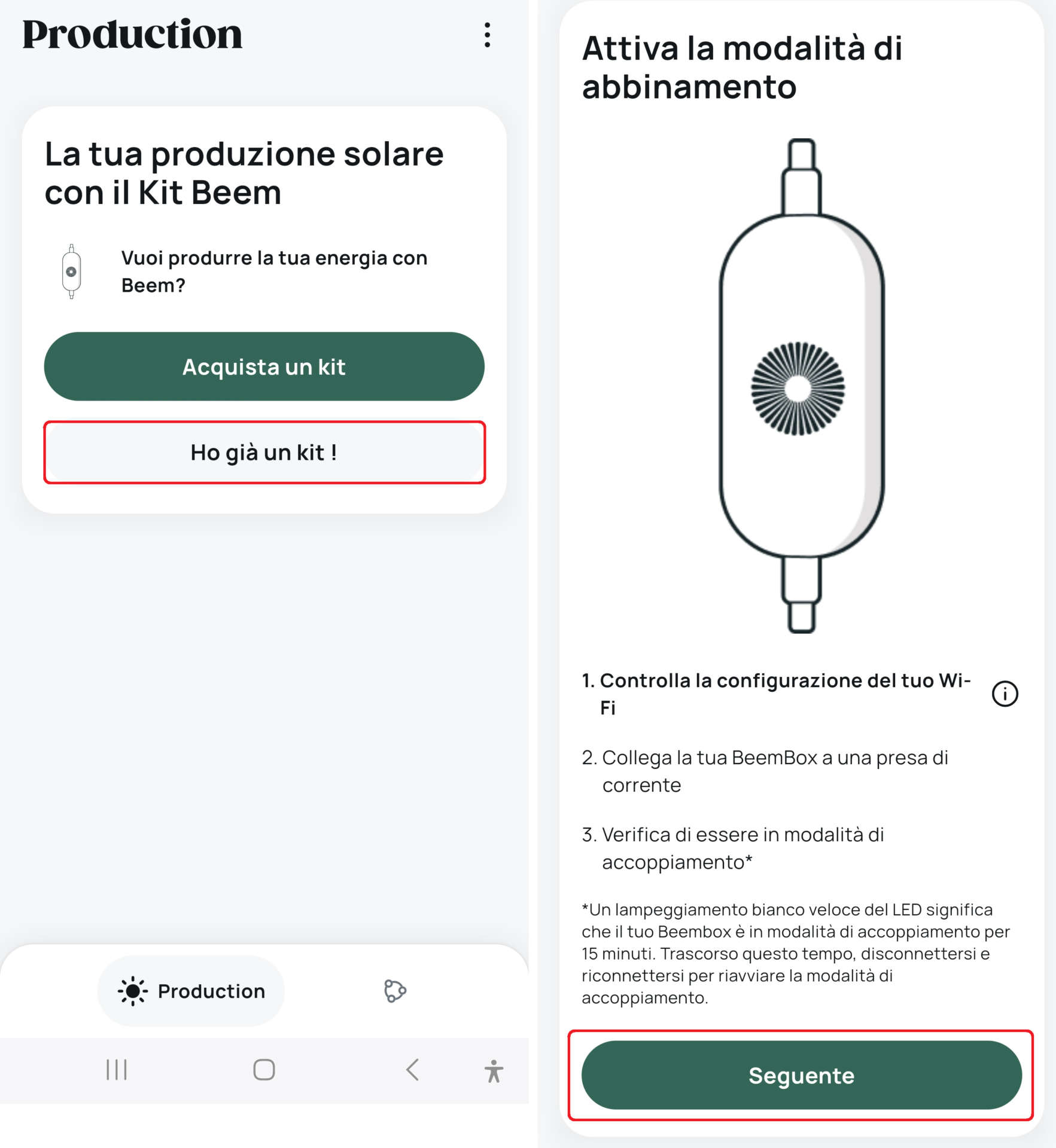 Aprite la app, create un account, cliccate su Ho già un kit, collegate la spina Schuko del Beembox alla presa di corrente e attendete che il led bianco lampeggi velocemente (modalità associazione).