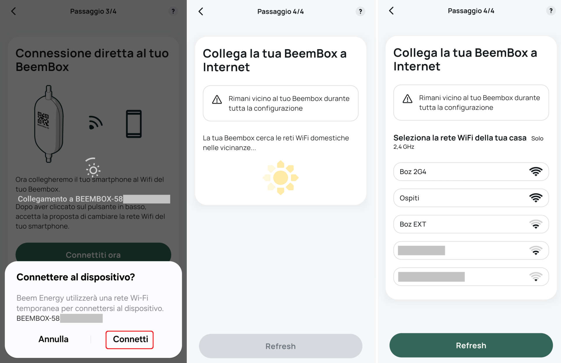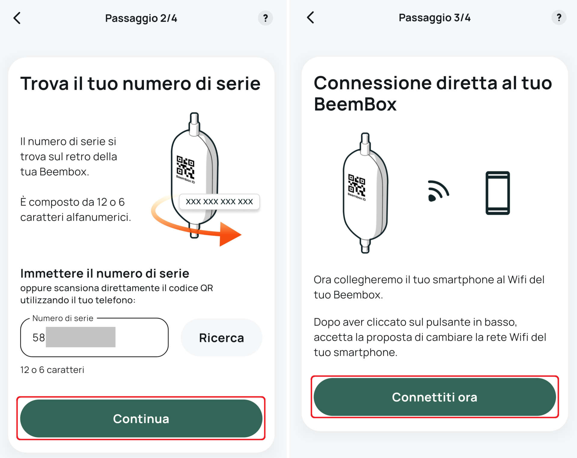 Quando il led bianco lampeggia cliccate su Seguente, inserite il numero di serie del Beembox (o scattate una foto al QR Code con lo smartphone – click su Ricerca), cliccate su Continua e poi su Connettiti ora.