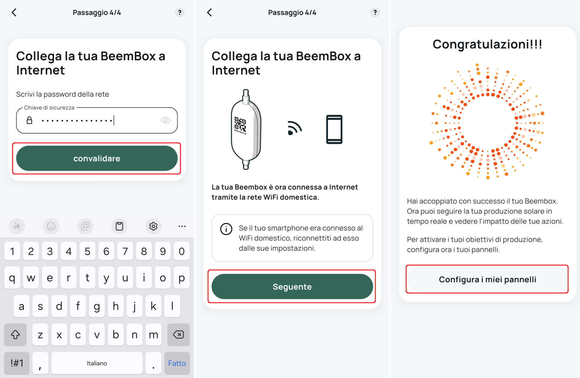 Digitate la password della rete Wi-Fi appena selezionata, attendete qualche secondo fino alla comparsa del messaggio di conferma connessione a internet e cliccate su Seguente. La configurazione del Beem Kit è terminata.