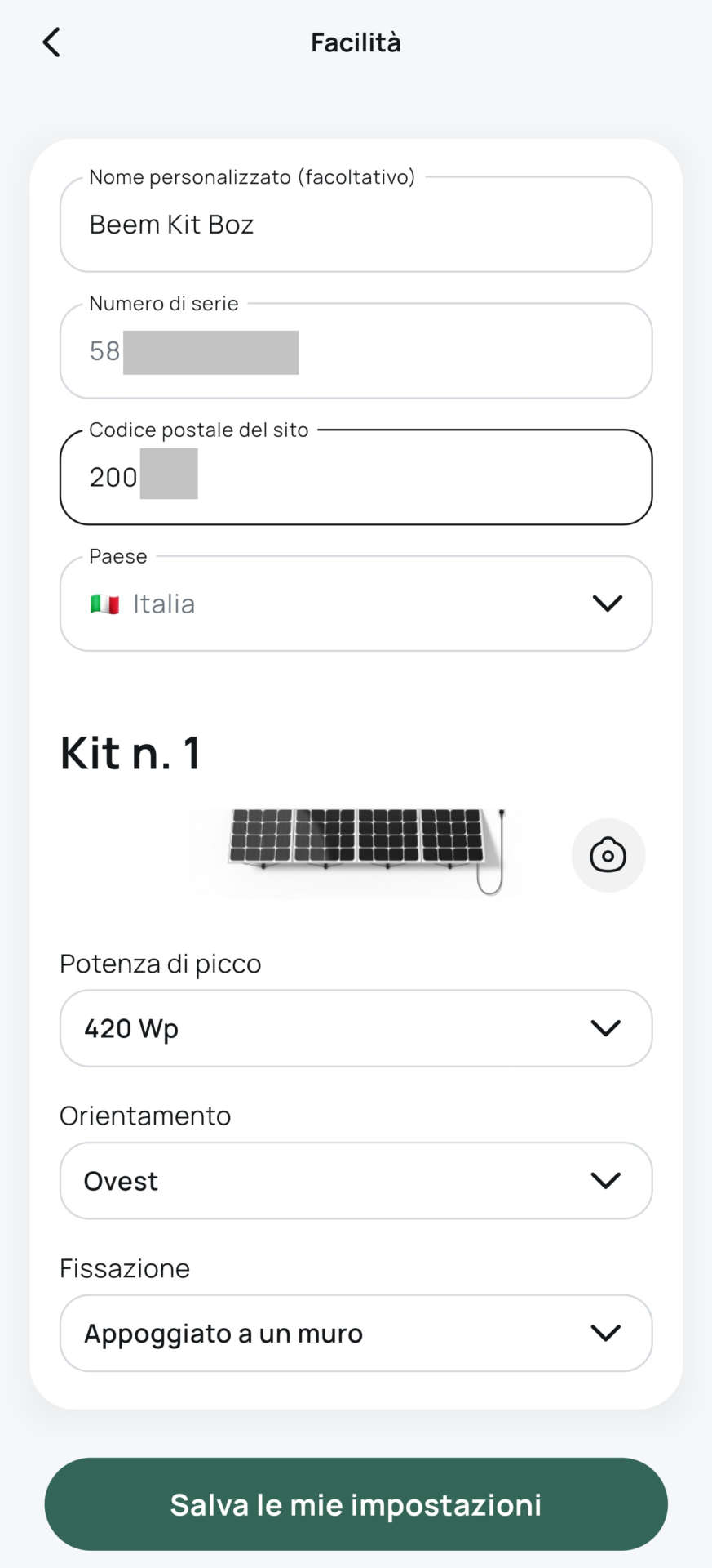 Ora cliccate su Configura i miei pannelli e inserite un nome personalizzato per il vostro Beem Kit (facoltativo), il codice postale della vostra località, l’orientamento dei pannelli e il metodo di fissaggio. Al termine cliccate su Salva le mie impostazioni per memorizzare i dati appena inseriti e ritornare alla schermata principale.