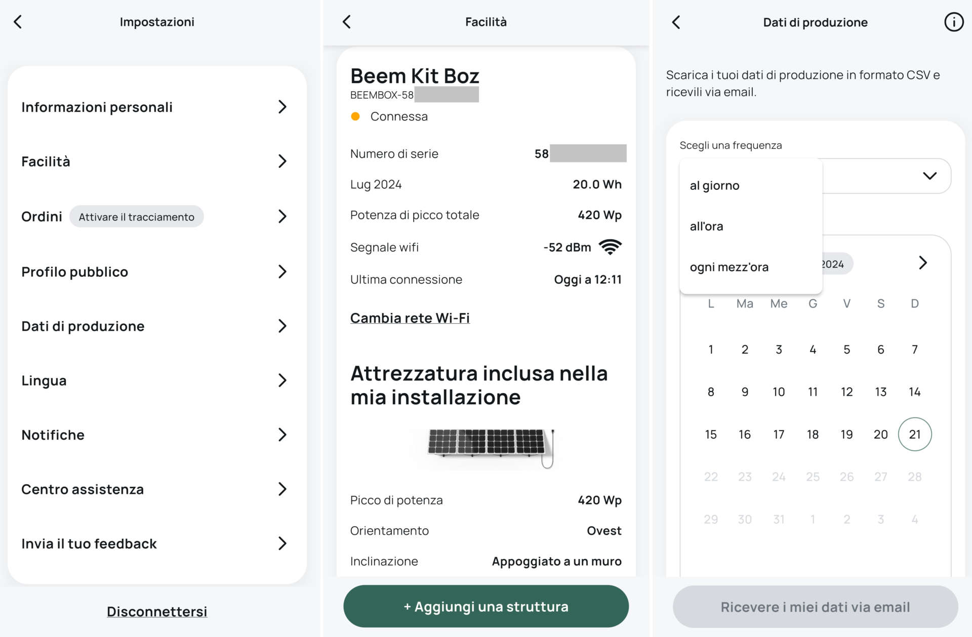 La app è piuttosto semplice e intuitiva: oltre alla home page con i dati di produzione energia permette solo di accedere alle impostazioni (tre puntini in alto a destra) con la scheda informativa del sistema (numero di serie, produzione mensile, potenza di picco, livello segnale Wi-Fi, ultima connessione, ecc.), creare automaticamente un report in formato CSV (da leggere con Excel o altro software compatibile) ogni 30 minuti, 60 minuti o 24 ore da ricevere via mail, attivare le notifiche sullo smartphone, ecc.
