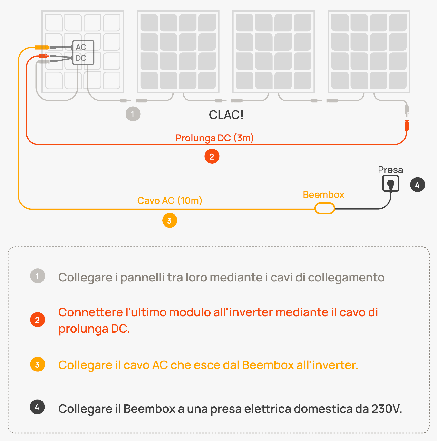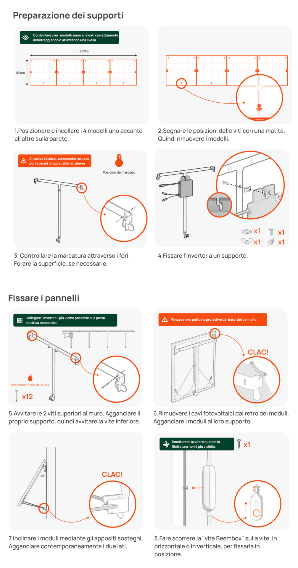 Si parte con l’assemblaggio dei supporti da terra oppure con il fissaggio dei supporti a muro con i tasselli e le viti in dotazione, l’agganciamento dei moduli solari (semplice e veloce grazie ai morsetti a molla) per finire con il fissaggio del micro-inverter all’ultimo supporto e del Beembox.