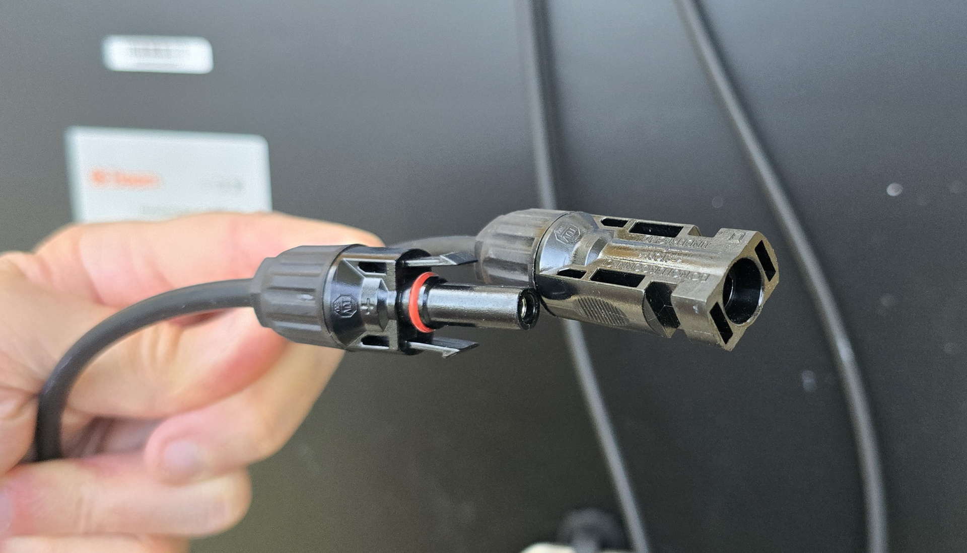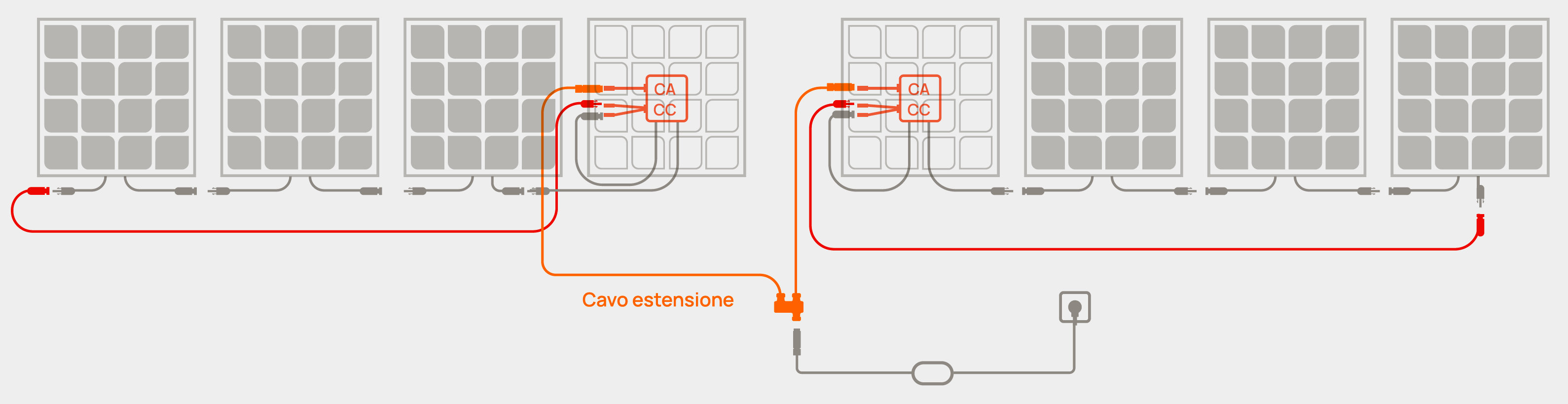 Terminata questa fase si procede con i collegamenti dei pannelli fotovoltaici tra loro (in serie – connettore maschio di un pannello con quello femmina del pannello vicino), dell’ultimo pannello con il micro-inverter, del micro-inverter al Beembox.