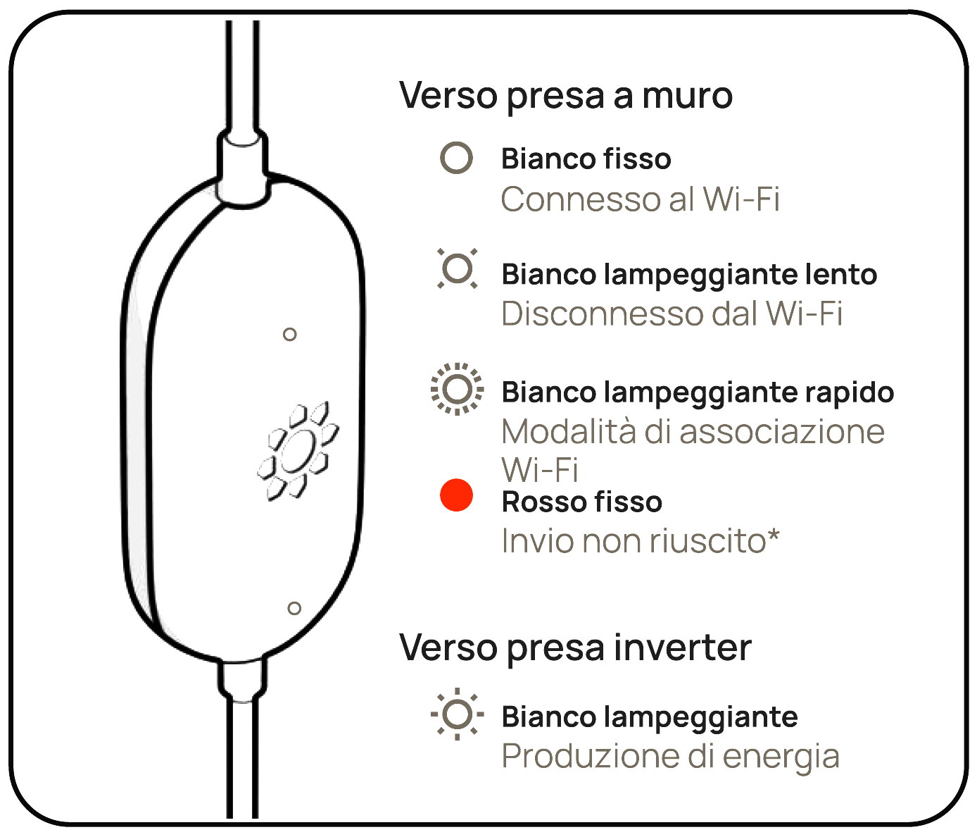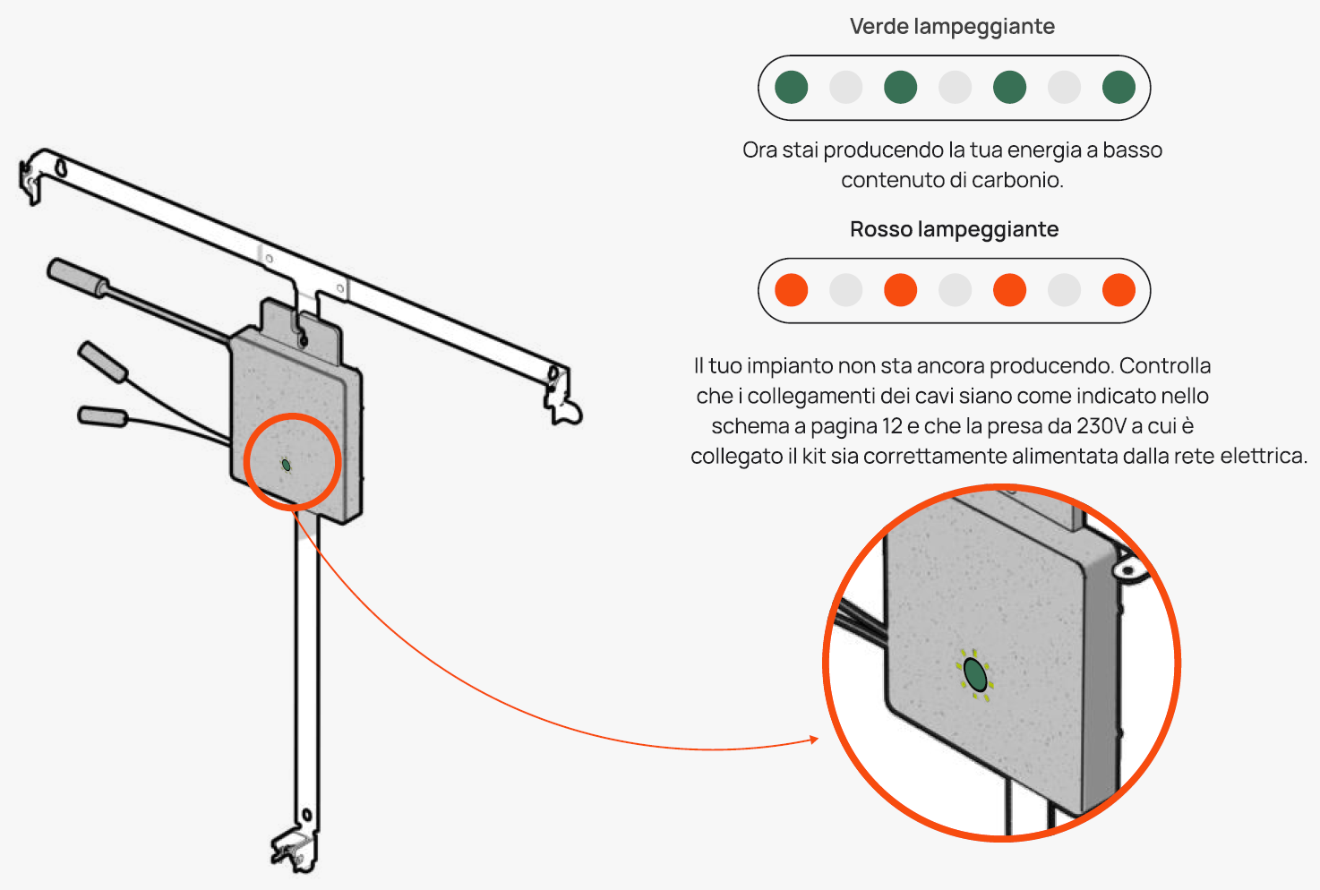 I due led del Beembox segnalano lo stato del Wi-Fi (connesso, disconnesso, invio dati non riuscito), la modalità di associazione (led bianco lampeggiante) e la produzione di energia.