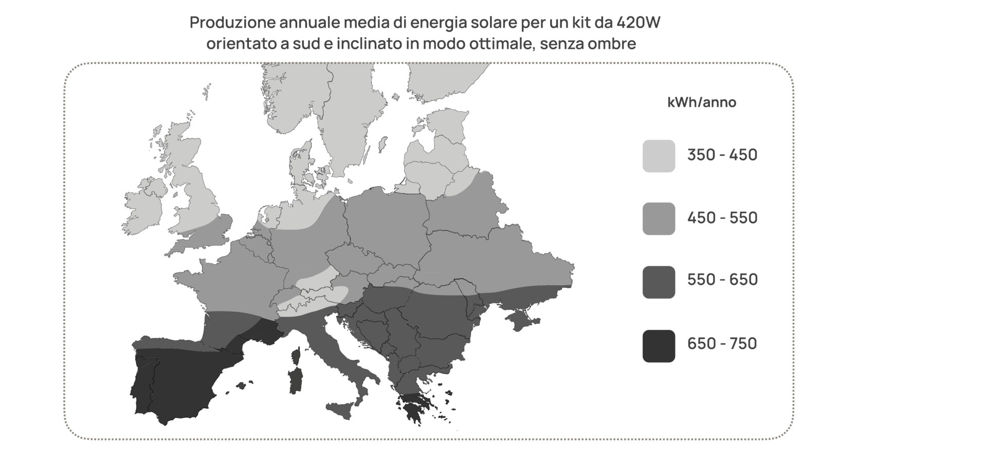 Il kit Beem in versione 420W posizionato a regola d’arte (orientamento a sud, inclinazione ottimale, nessun ostacolo, ecc.) può produrre fino a 585 chilowattora all’anno.