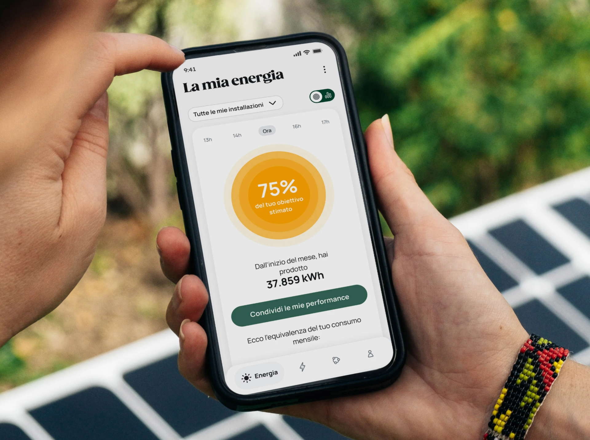 Nella schermata principale della app compaiono i dati di produzione mensile (kWh e percentuale rispetto all’obiettivo stimato) con l’equivalente consumo mensile di uno o più dispositivi (smartphone, Tv, frigorifero, ecc.), quelli di produzione istantanea con la potenza media in watt negli ultimi 3 minuti e il grafico di produzione giornaliera (icona barre in alto a destra).