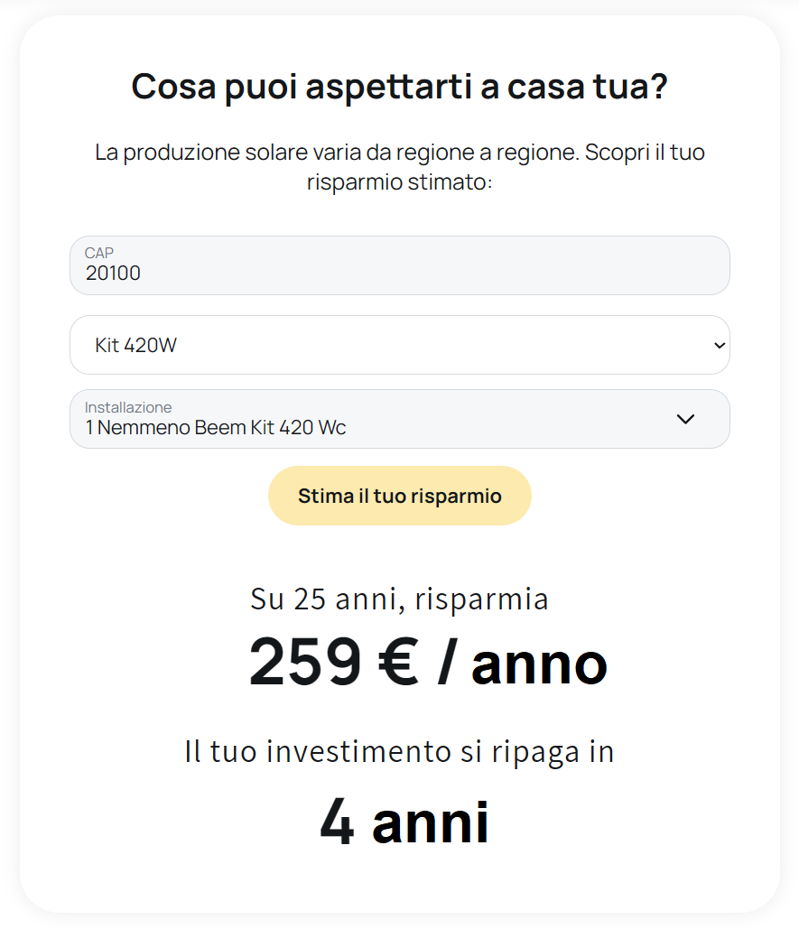 Secondo i risultati dello strumento di calcolo Beem, il risparmio medio in bolletta nell’arco di 25 anni ammonta a circa 250-260 euro all’anno, sufficienti per ammortizzare il costo iniziale in soli 4 anni.