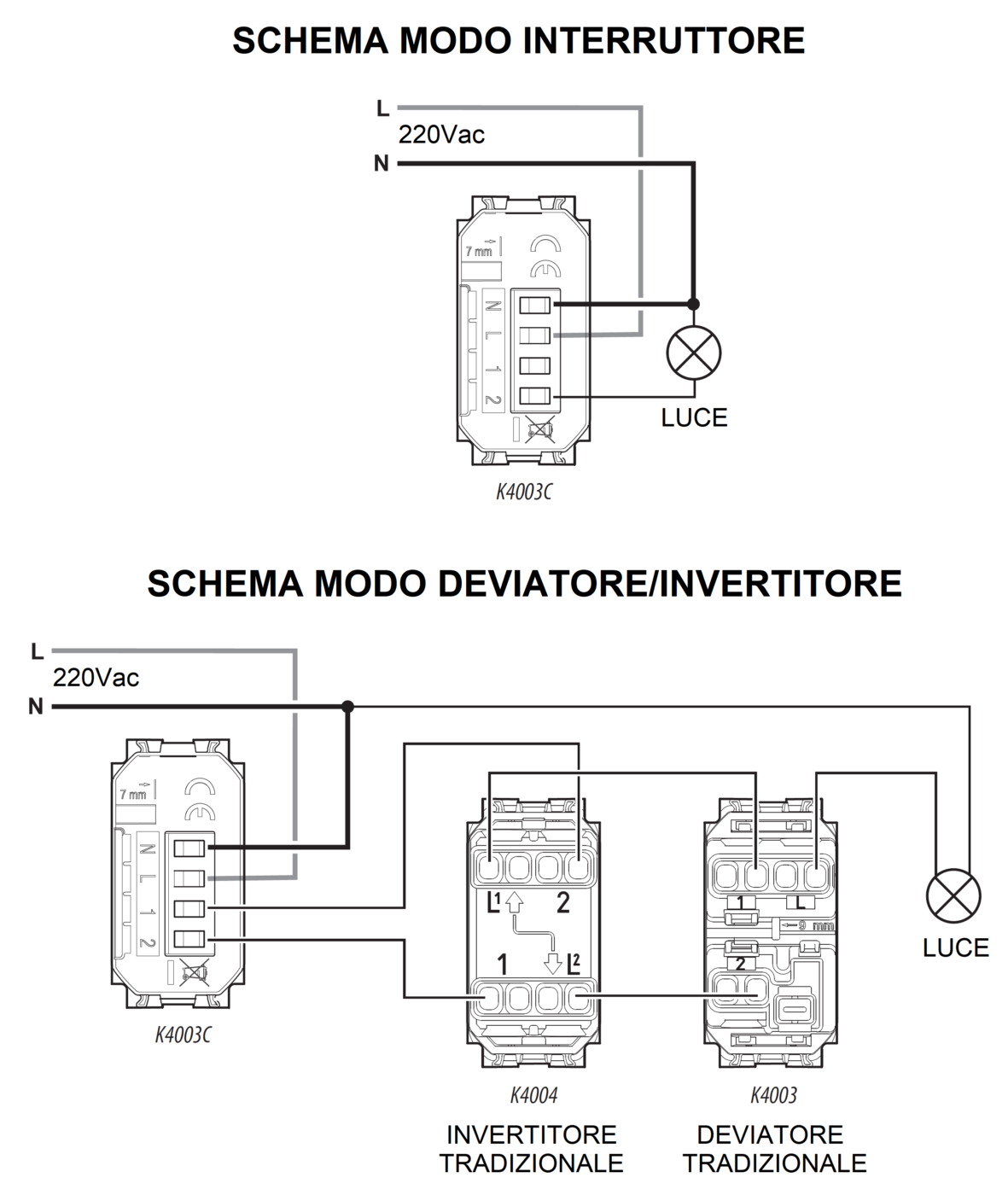 Il deviatore K4003C per il comando luce richiede invece anche il cavo del neutro, spesso assente negli interruttori o deviatori tradizionali. Ciò significa che potrebbe essere necessario infilare un nuovo cavo dalla scatola di derivazione più vicina (morsetto neutro).