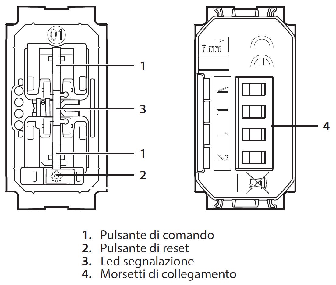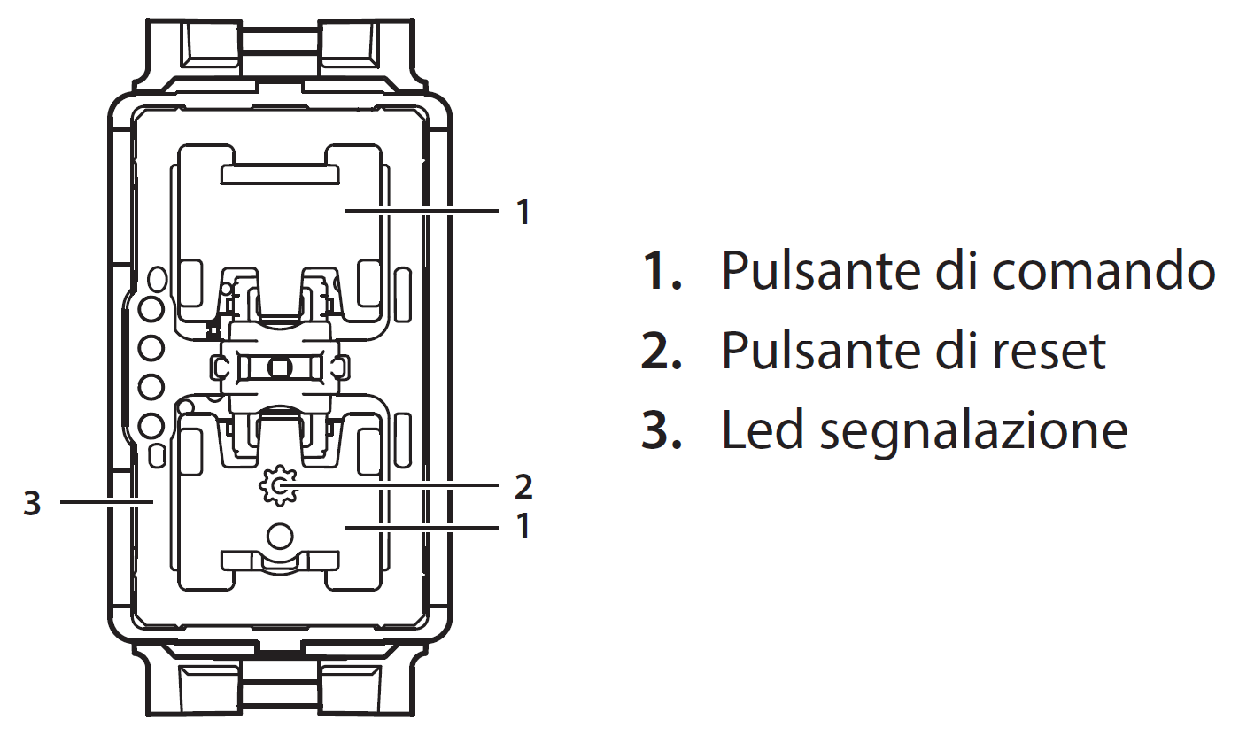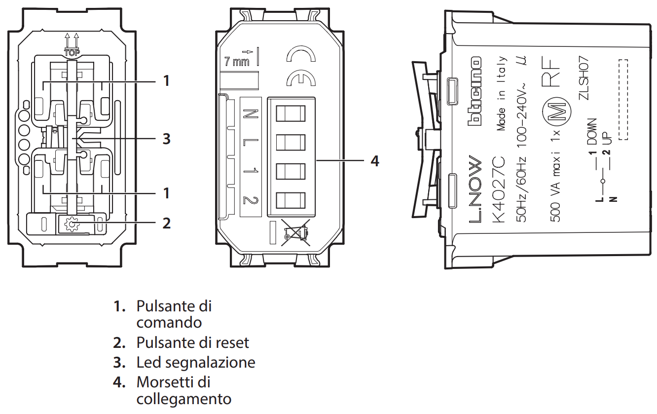Include due pulsanti, il tasto di reset ed una spia led di segnalazione, localizzazione e stato carico configurabile dalla app Home+Control. Inoltre può essere associato ad uno o più comandi wireless come il K4570CWI visto sopra.