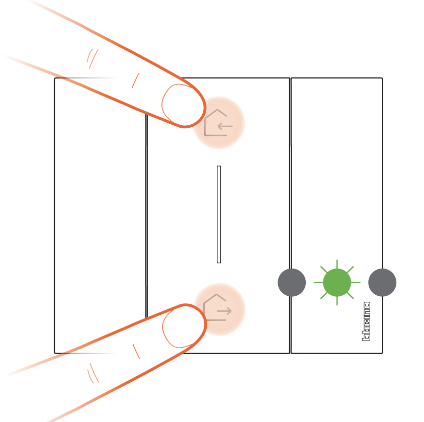 Se i led di tutti i comandi connessi (tapparelle, luci, ecc.) si accendono di verde fisso entro 15 minuti (quello del comando wireless rimane invece spento) potete concludere la procedura di associazione premendo brevemente entrambi i tasti come nella figura sopra. Il led lampeggia di verde una volta e si spegne mentre i led dei comandi connessi si spengono.