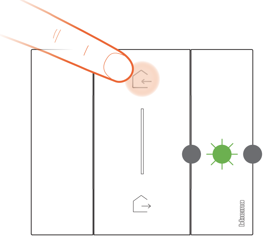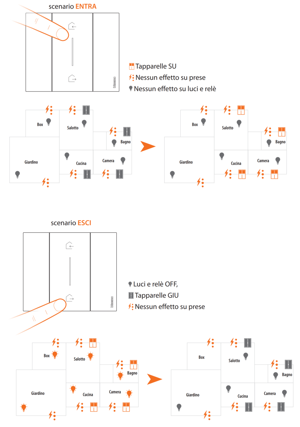 Dopo aver associato il comando wireless e atteso qualche minuto potete attivare gli scenari Entra/Esci premendo il tasto superiore (entra) per alzare tutte le tapparelle oppure il tasto inferiore (esci) per spegnere tutte le luci e abbassare le tapparelle senza bisogno di agire sui singoli comandi presenti nelle varie stanze.