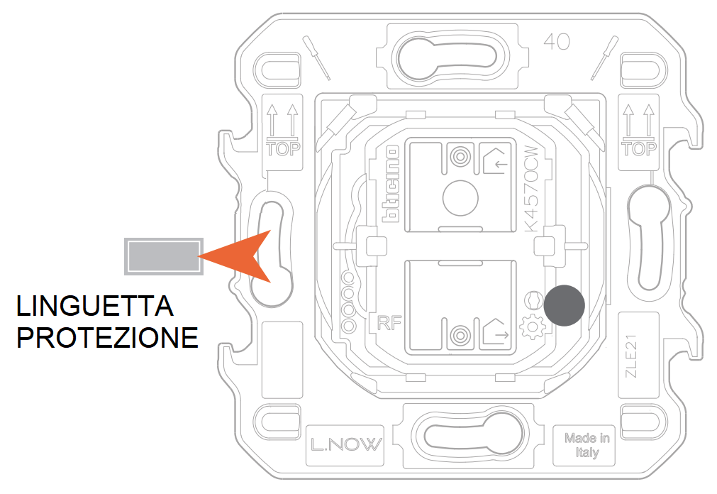 Per configurare il nuovo impianto domotico spegnete l’interruttore generale (luci, prese) o il salvavita sul quadro elettrico per almeno 30 secondi. Riaccendetelo, attendete un minuto per l’avvio dell’impianto ed eseguite la procedura di prima configurazione (associazione) entro 15 minuti dalla riattivazione dell’interruttore generale. Rimuovete la linguetta di protezione dal comando wireless K4570CWI e montate la cover e la placca.