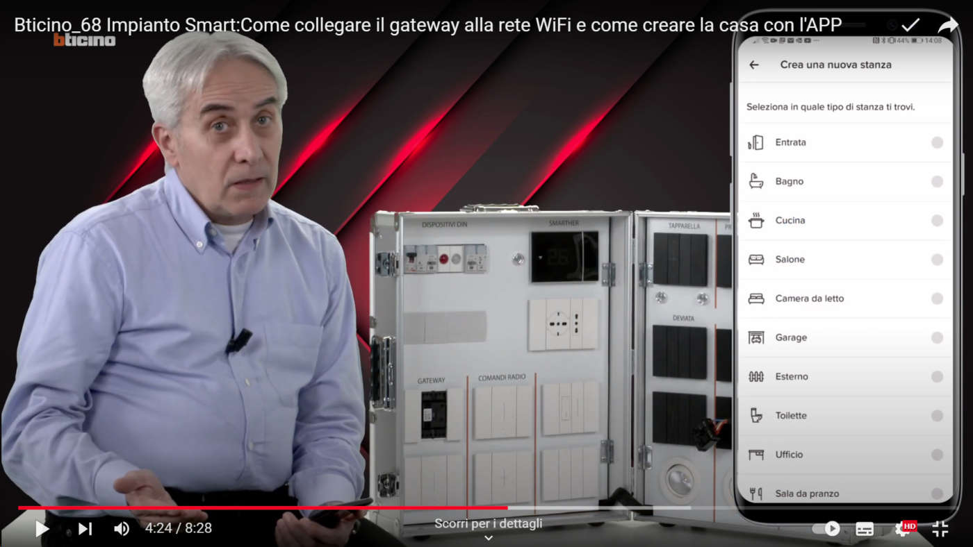 Selezionate il brand dei prodotti da configurare (BTicino), il tipo di gateway (modulo gateway con scenario generale nel nostro caso), selezionate la rete Wi-Fi di casa (solo 2,4 GHz), digitate la password e seguite le istruzioni che appaiono sulla app e in questo video tutorial.