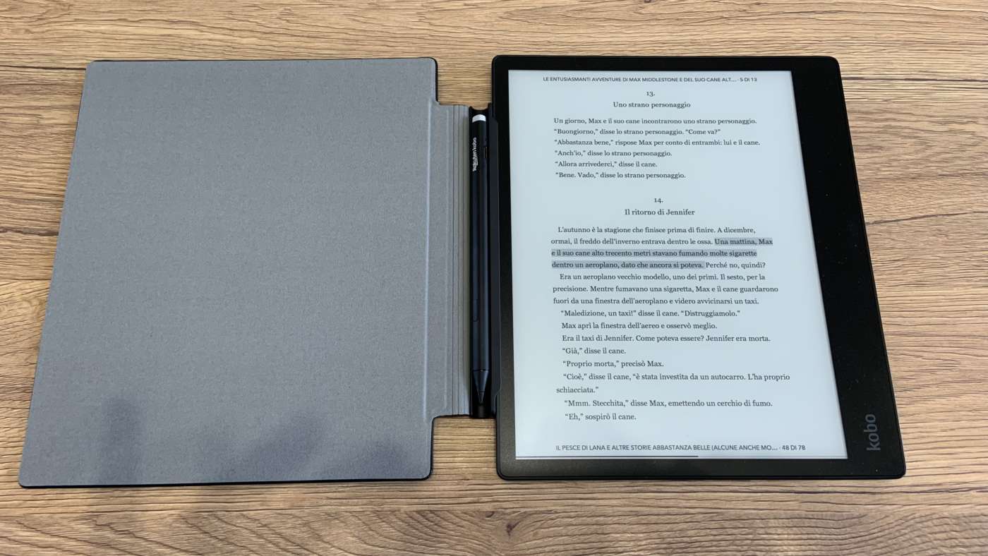Lo schermo ampio, molto più di quello dei lettori più venduti, l’abbiamo trovato estremamente pratico nella lettura in particolare di fumetti e PDF, questi ultimi spesso pensati in formato A4, equivalente a uno schermo da circa 14 pollici e qui quindi renderizzati molto bene; con quest’ultimo formato si perdono alcune funzionalità tipiche dei veri e-book, quali la possibilità di cambiare la dimensione e la spaziatura dei caratteri, ma resta possibile prendere appunti attraverso la penna digitale, detta anche stilo, inclusa con il lettore. Uno strumento rende pratica la rimozione dei bordi bianchi, zoomando sul testo e agevolando ancora di più la lettura.