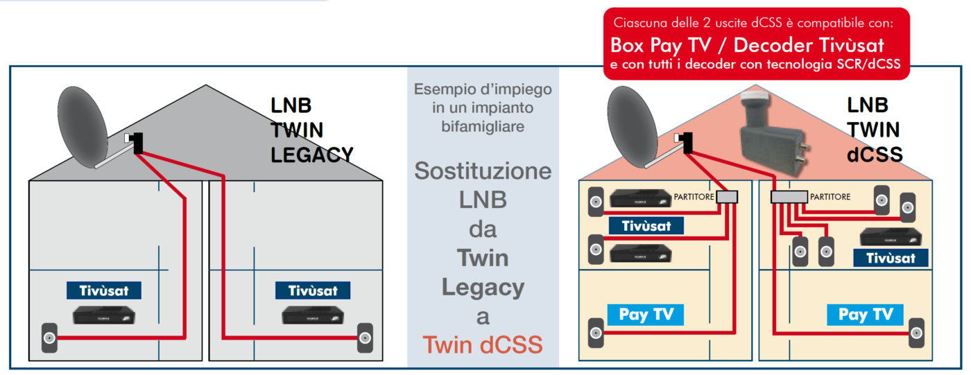 Le due uscite dCSS indipendenti (retrocompatibili SCR) permettono di servire fino a 32 prese SAT (per altrettanti decoder/Tv oppure due Sky Q e altri ricevitori satellitari come quelli di tivùsat) con due soli cavi coassiali che scendono dalla parabola.
