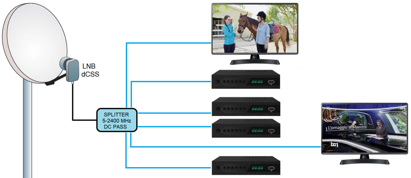Grazie alla tecnologia dCSS è possibile collegare molteplici decoder e Tv con uno o più sintonizzatori (come gli Sky Q) utilizzando un solo cavo ed uno o più partitori di segnale idonei come questi.
