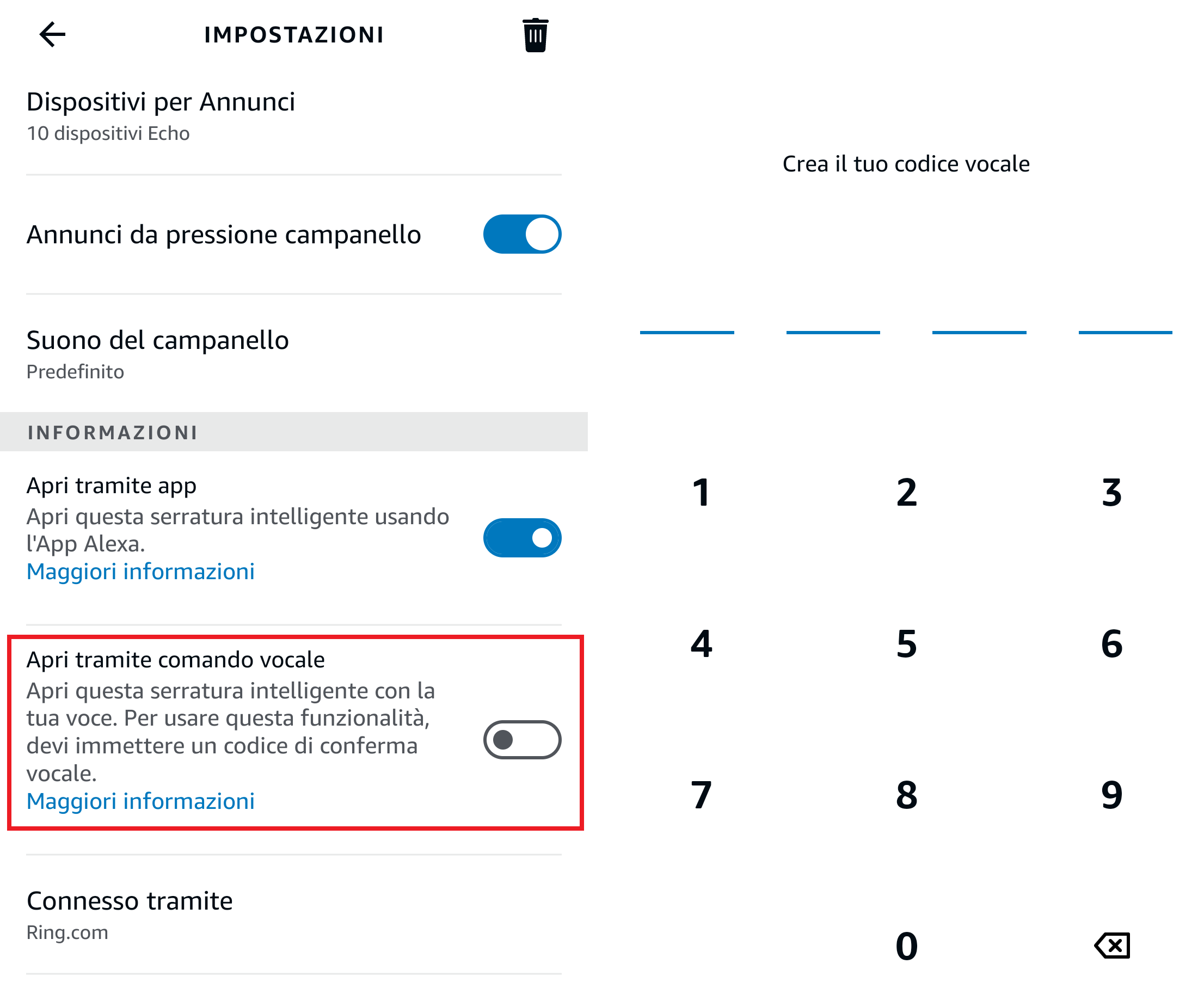Per ragioni di sicurezza, l’apertura del cancello/portone richiede anche la configurazione dello sblocco vocale sempre dalla app Alexa (Dispositivi > Tutti i dispositivi > Ring Intercom o altro nome – es.: Ingresso > Impostazioni > Apri tramite comando vocale) ma solo dopo aver creato un codice numerico (es.: 1-2-3-4) da pronunciare dopo la richiesta vocale di apertura.