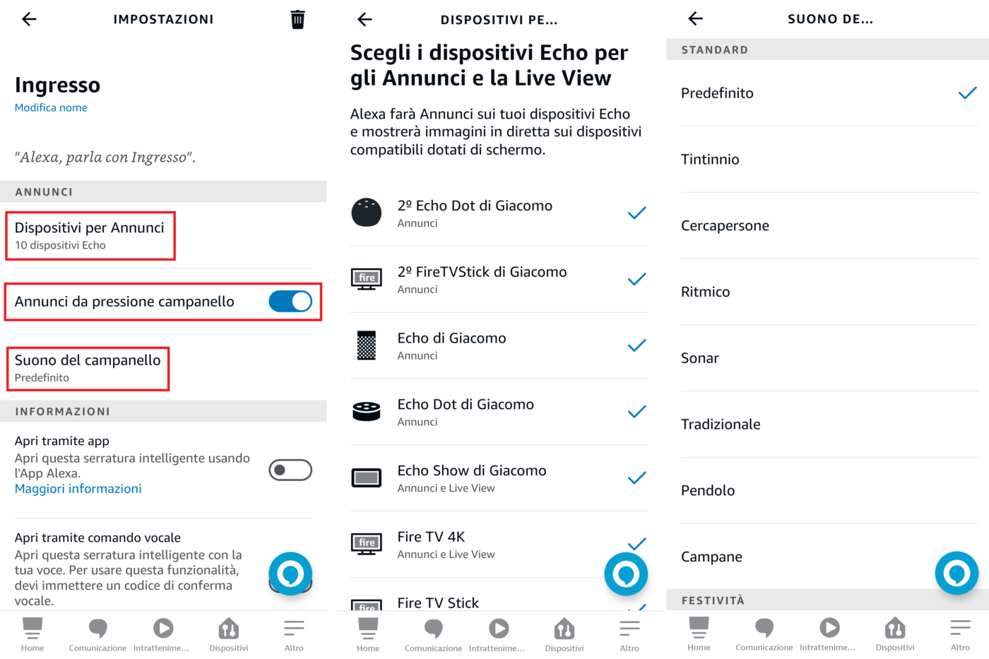 Per ricevere sul dispositivo Alexa le notifiche e gli annunci dovete abilitarli dalla app Alexa (Dispositivi > Tutti i dispositivi > Ring Intercom o altro nome – es.: Ingresso), attivare la voce Annunci da pressione del campanello e scegliere quali dispositivi si attiveranno (con annuncio e/o melodia a scelta) ogni volta che qualcuno suona al citofono.