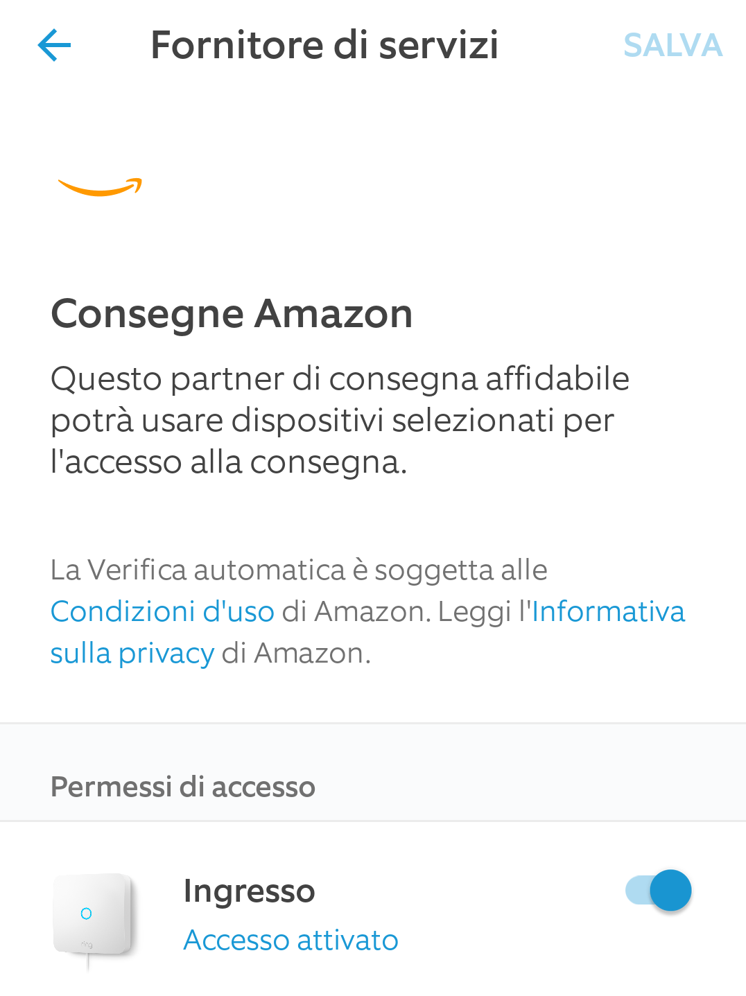 Altra funzione molto interessante è la verifica automatica per le consegne di Amazon per ricevere i pacchi ordinati tramite accesso automatico, controllato e limitato nel tempo anche in vostra assenza (menu > dispositivi > Ring Intercom > Accesso condiviso > Consegne verificate automaticamente > Consegne Amazon > Permessi di accesso > Accesso attivato).