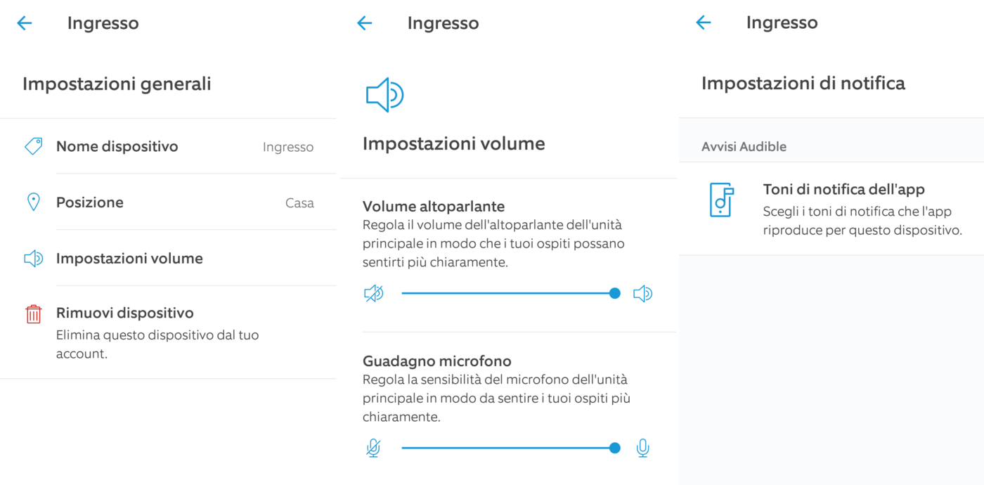L’icona Impostazioni dispositivo vi permette di gestire i toni di notifica della app Ring (popup, vibrazione, ecc.), cambiare il nome del dispositivo, la posizione (casa, ufficio, ecc.), regolare il volume e il guadagno del microfono.