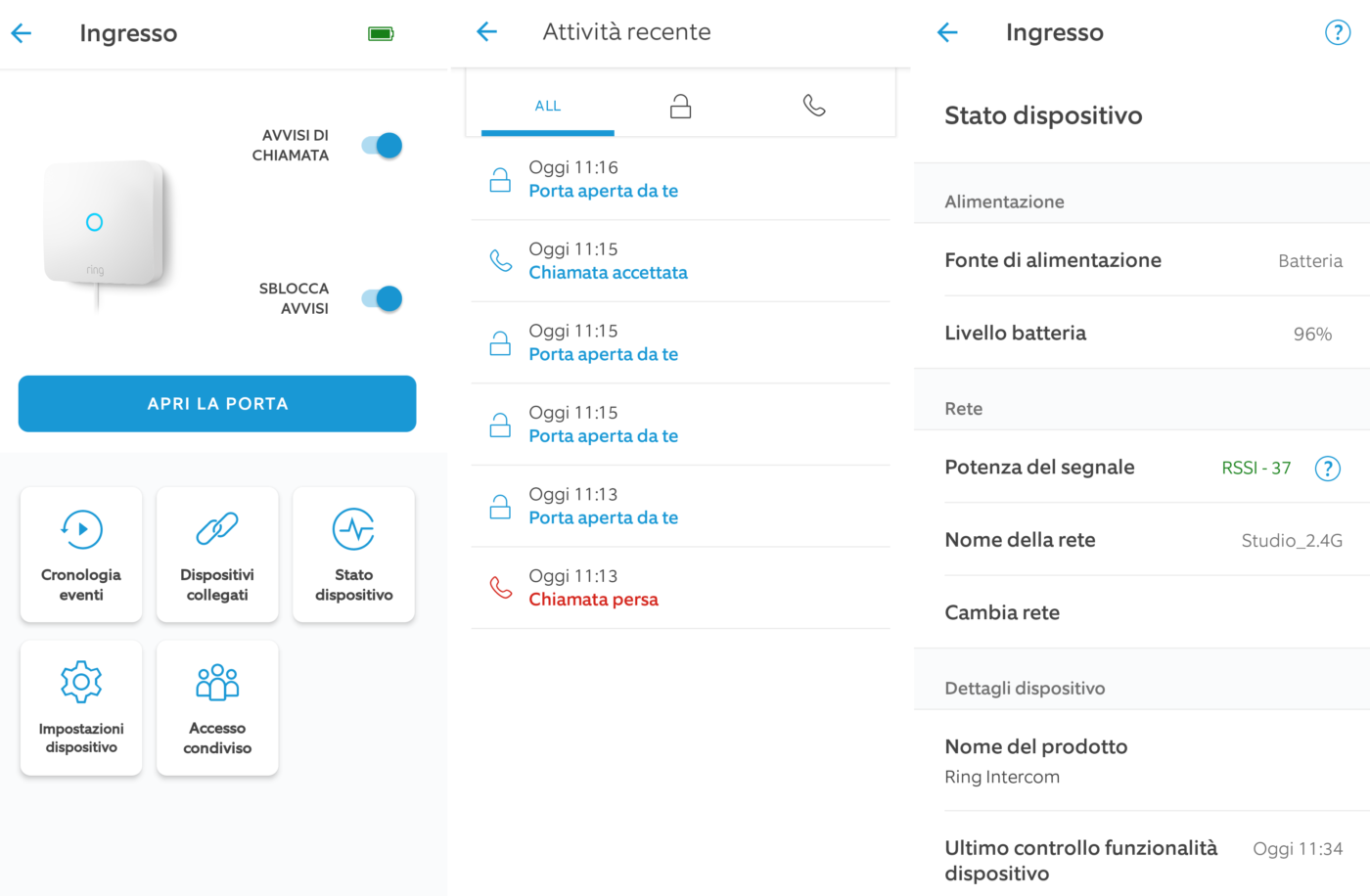 Dalla schermata home di Ring Intercom (menu > dispositivi > Ring Intercom) potete visualizzare lo stato del dispositivo (online/offline, livello batteria, potenza segnale Wi-Fi, nome/cambio rete Wi-Fi, ecc.), attivare/disattivare gli avvisi di chiamata, aprire la porta, visualizzare i dispositivi collegati (es.: telecamera Ring) e consultare la cronologia eventi (chiamate, aperture, ecc.).