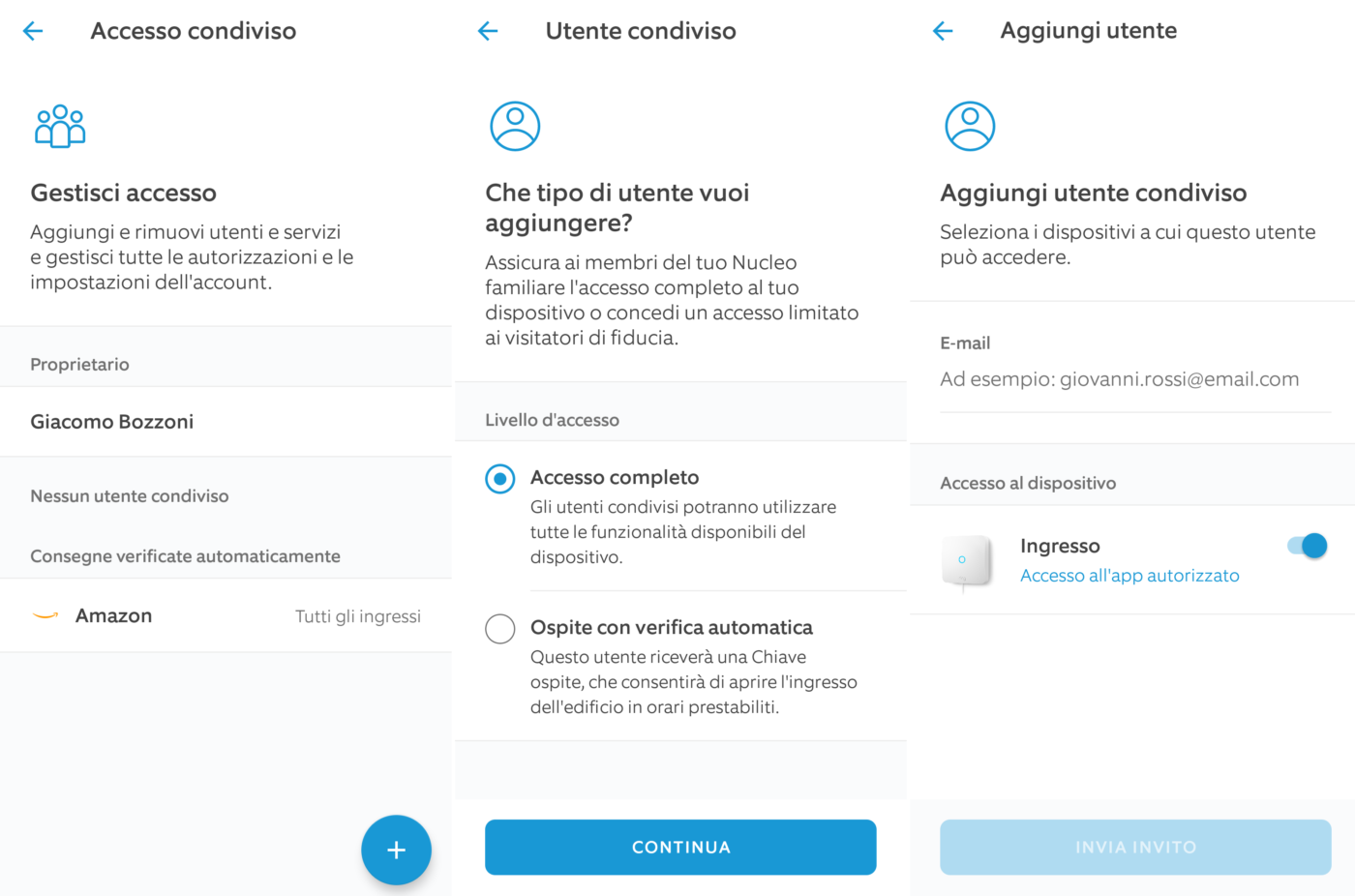 Per attivare la condivisione basta accedere alla schermata home (vedi sopra) e cliccare su Accesso condiviso. Cliccate sull’icona + in basso a destra, selezionate Accesso completo, inserite l’indirizzo mail delle persone con le quali volete condividere il vostro Ring Intercom, abilitate l’accesso e cliccate su Invia invito.