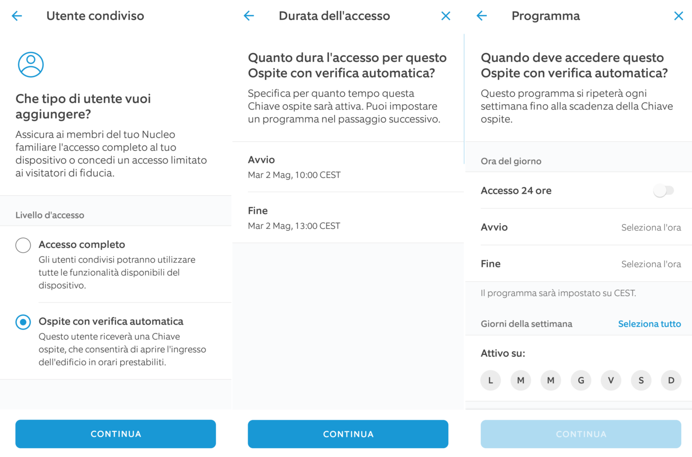Potete impostare la durata di accesso (data e ora di inizio/fine), assegnare un accesso continuo, impostare un accesso programmato (es.: dal lunedì al venerdì dalle 12h00 alle 15h00) oppure permanente (24/7).