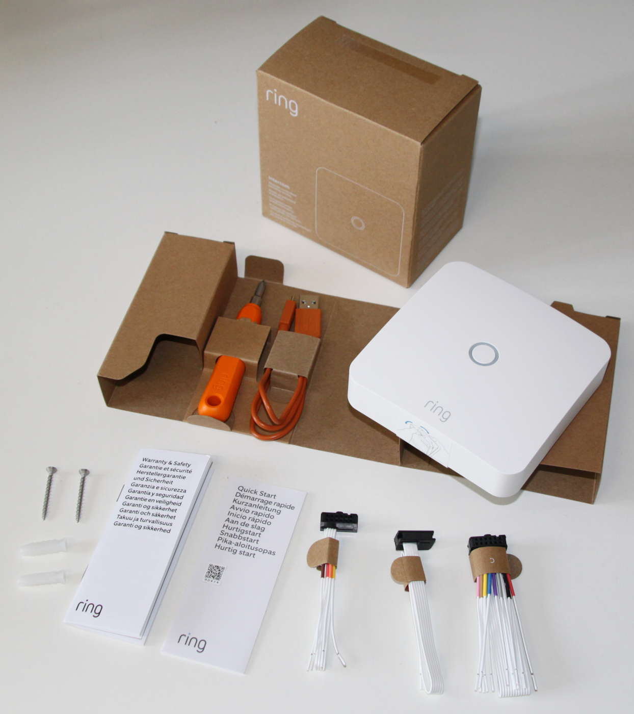 Oltre al modulo Ring Intercom con la batteria già installata, la dotazione comprende un cavo USB/Micro-USB, tre cavi di collegamento al citofono (A, B e C), il manuale utente (guida rapida), il cacciavite doppio (taglio e stella), due viti ed altrettanti tasselli.
