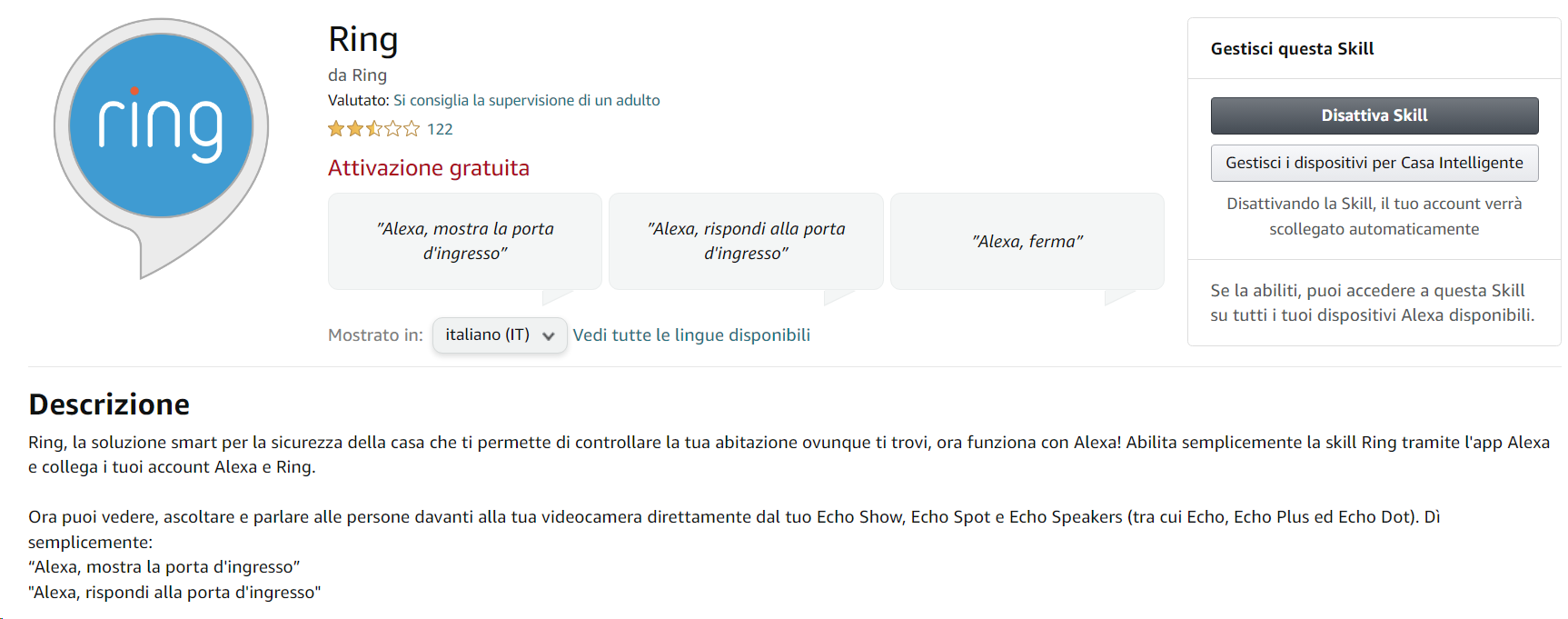 Per abilitare i comandi vocali di Alexa dovete innanzitutto cercare la skill Ring nella app Alexa, attivarla e associare il vostro account Ring a quello di Amazon (anche durante la configurazione iniziale – vedi questa guida – MOD LINK). A questo punto riceverete alcune notifiche push sullo smartphone e via mail a conferma dell’attivazione (es.: “La Skill Ring è ora collegata”) e potrete rivolgervi a Ring Intercom tramite la voce.
