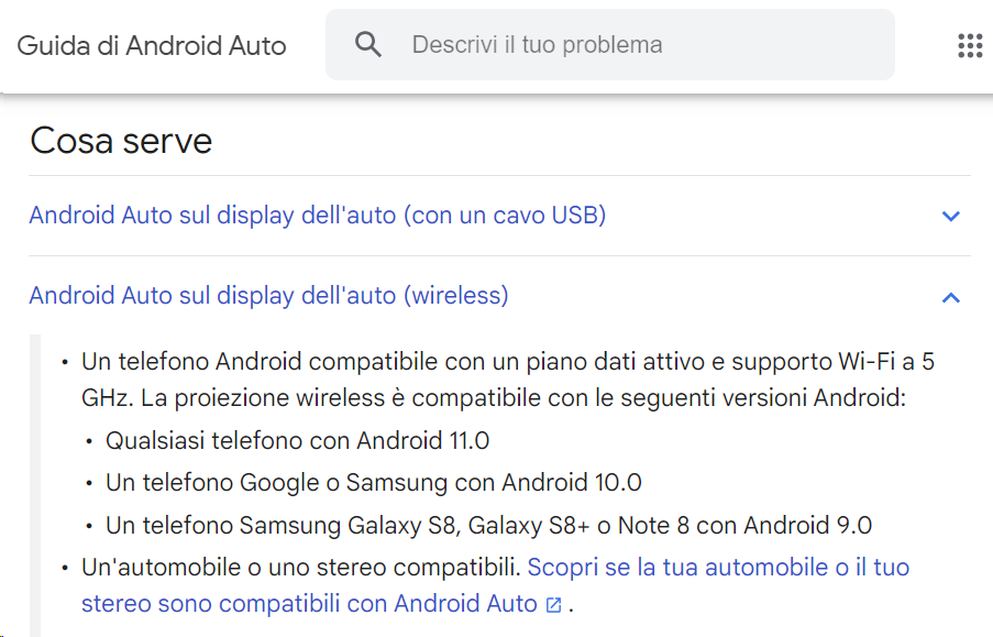 Inoltre è bene sapere che Android Auto wireless ha requisiti più stringenti rispetto al cavo USB: di norma funziona solo sugli smartphone Samsung con Android 9-10 o superiore, sui Google Pixel con Android 10-11-12-13 e su quasi tutti gli altri modelli/marchi con Android 11-12-13. È obbligatorio avere anche la connessione Wi-Fi a 5 GHz e non solo quella a 2,4 GHz.