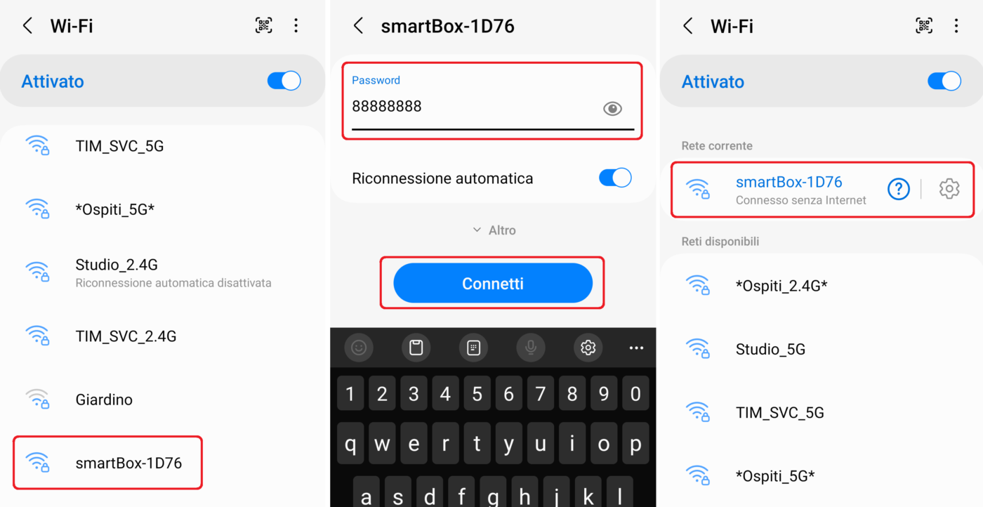 - Attivare il Wi-Fi dello smartphone (da menu a tendina o impostazioni Android), selezionare la rete “smartBox-****”, digitare la password 88888888 e attendere la connessione;