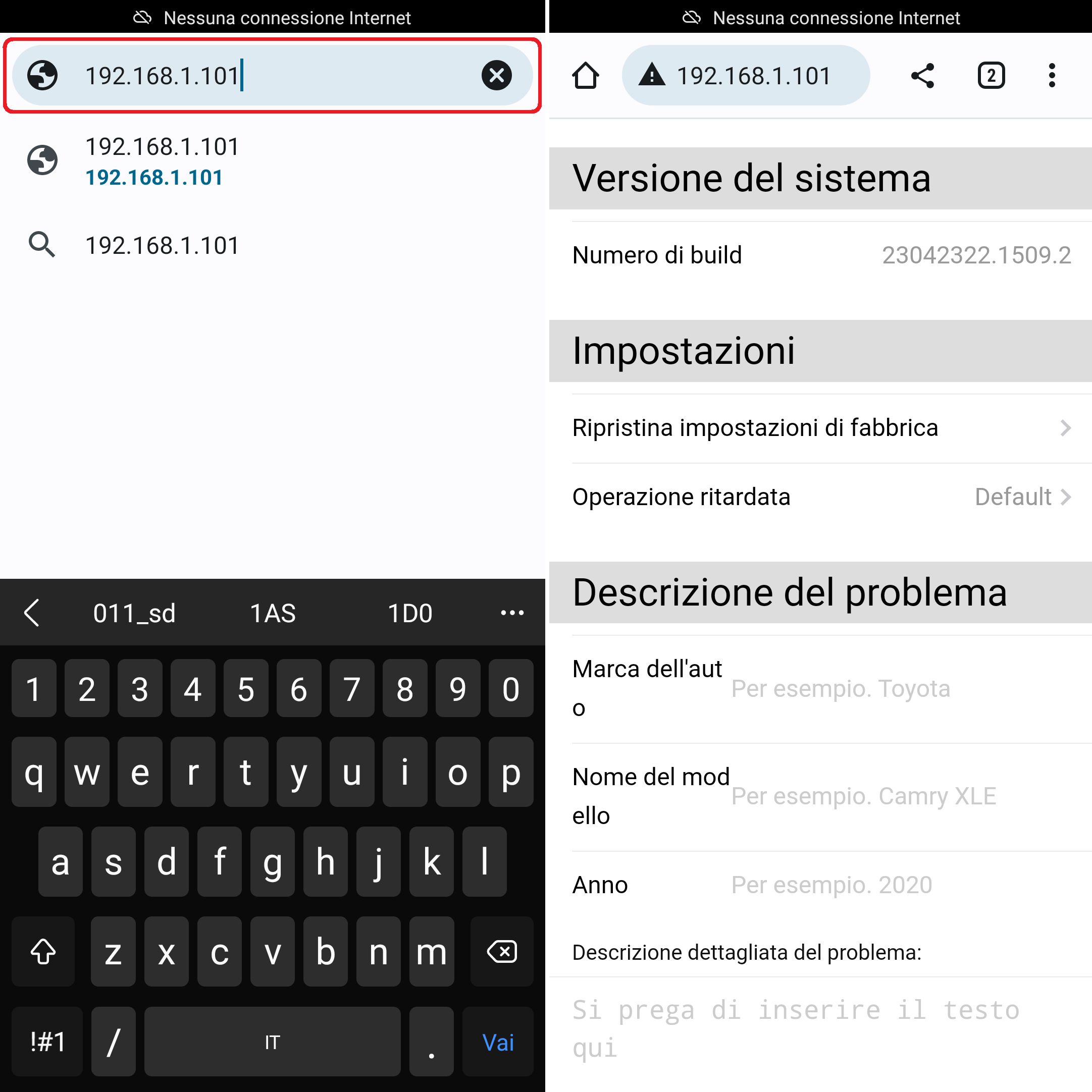 - La schermata ospita le informazioni di sistema (es.: numero build/versione software), le impostazioni avanzate (operazione ritardata e ripristino delle impostazioni di fabbrica) e un modulo da compilare e inviare con i dati della vettura (marca, modello e anno) per richiedere assistenza in caso di necessità;