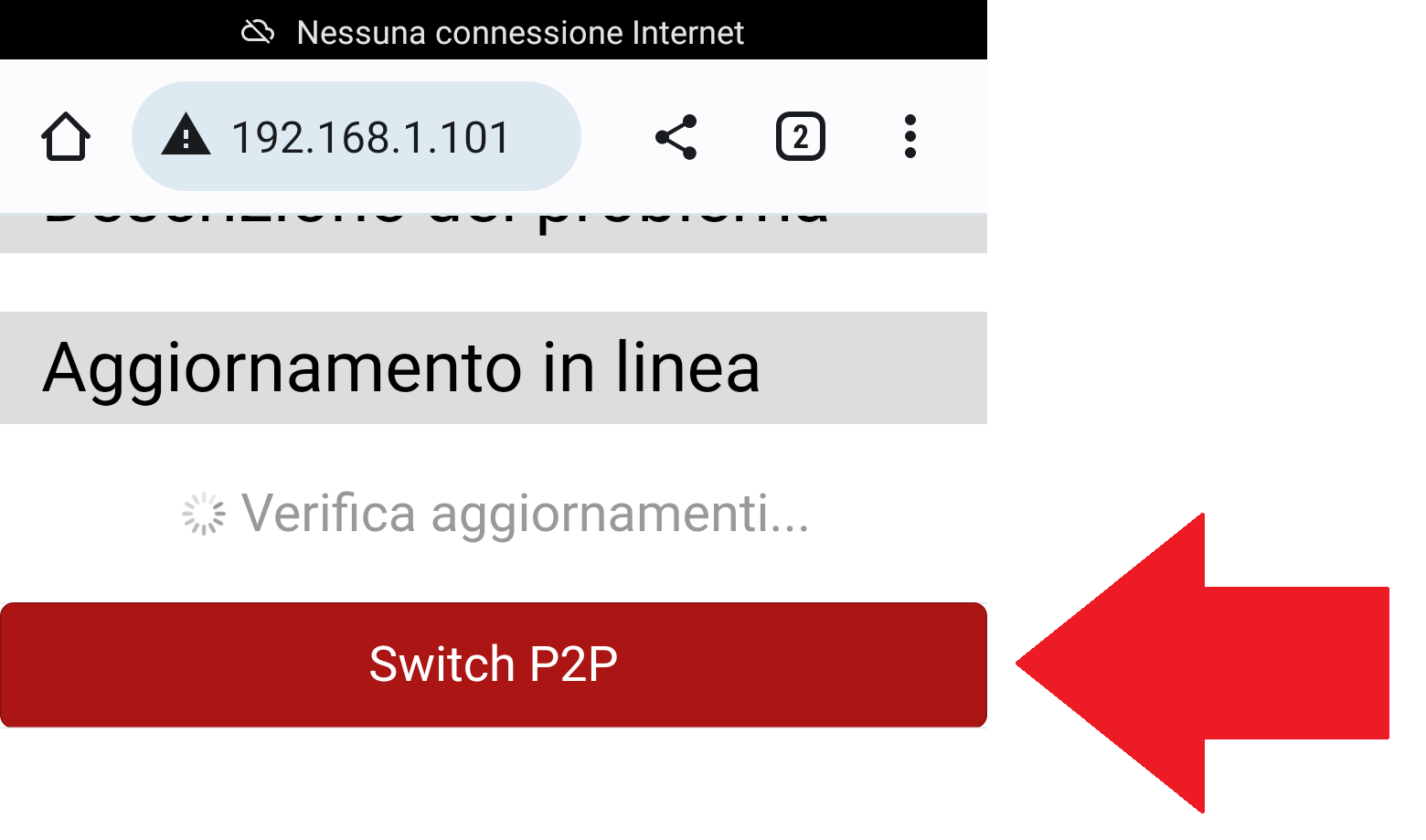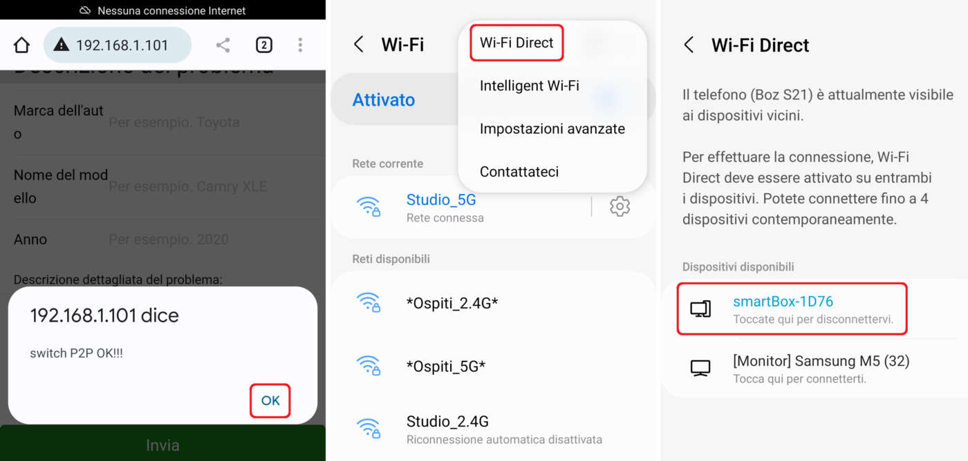 - Per aggiornare il box bisogna prima cliccare sul banner Switch P2P (con pop-up di conferma), ritornare alle impostazioni Wi-Fi sullo smartphone, selezionare la modalità Wi-Fi Direct, attendere la scansione delle reti disponibili e selezionare la rete “smartBox-****”;
