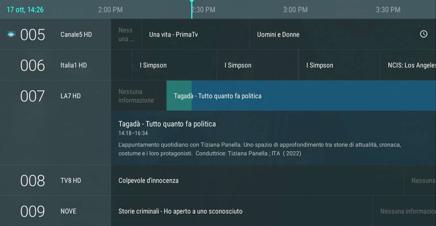 Il tasto EPG del telecomando (icona TV) mostra la guida dei programmi organizzati in una griglia temporale con ulteriori approfondimenti (puntata, trama, ecc.) e la possibilità di prenotare la visione (promemoria) premendo OK sull’evento futuro desiderato.