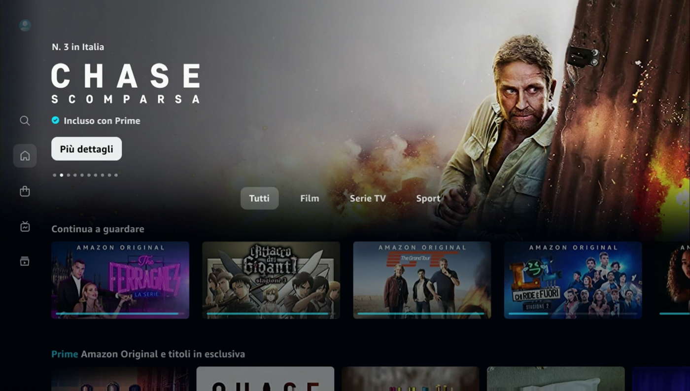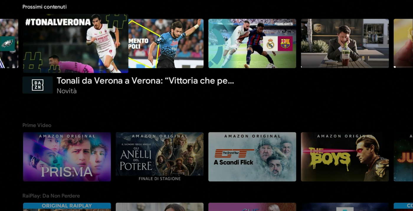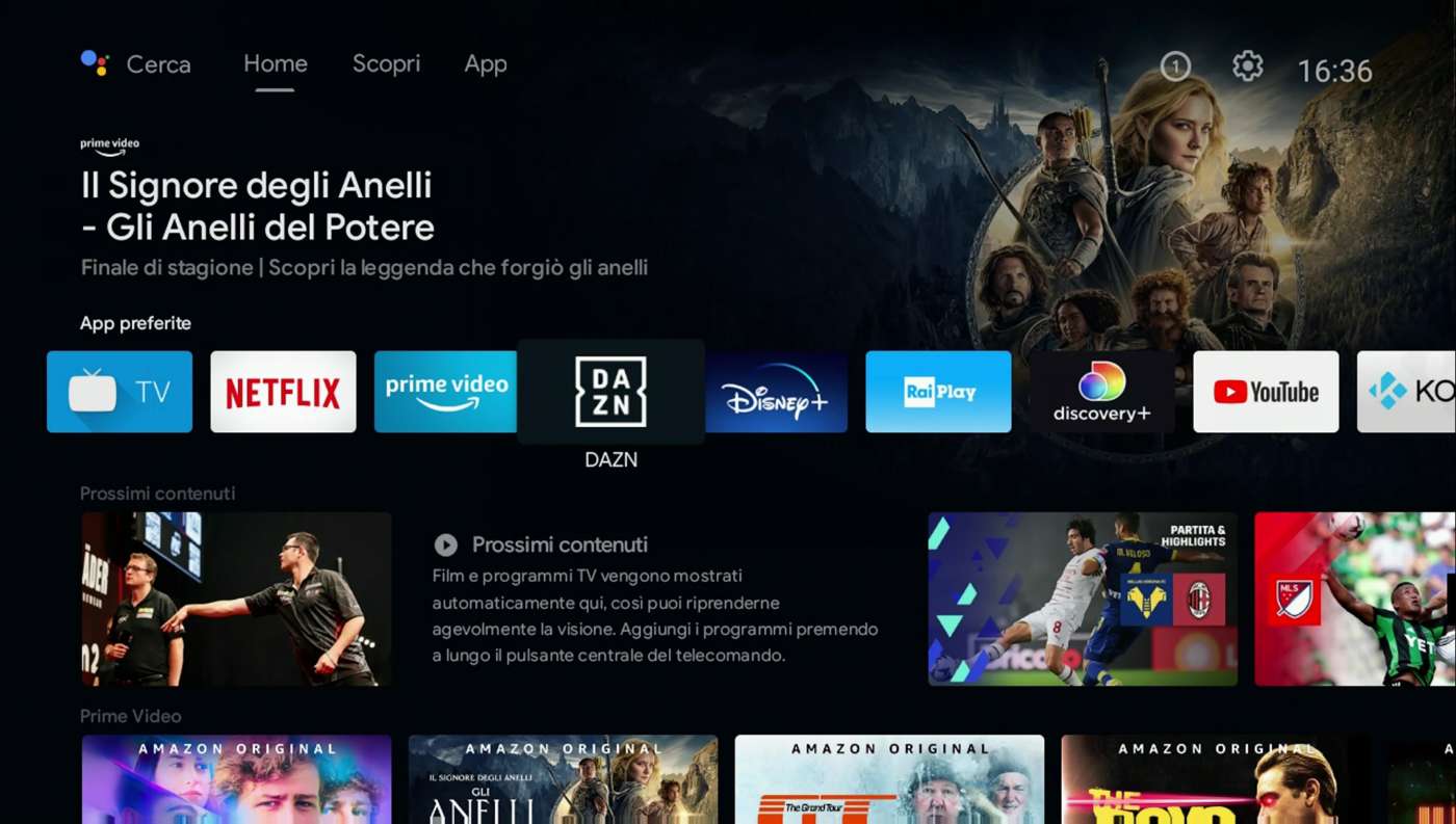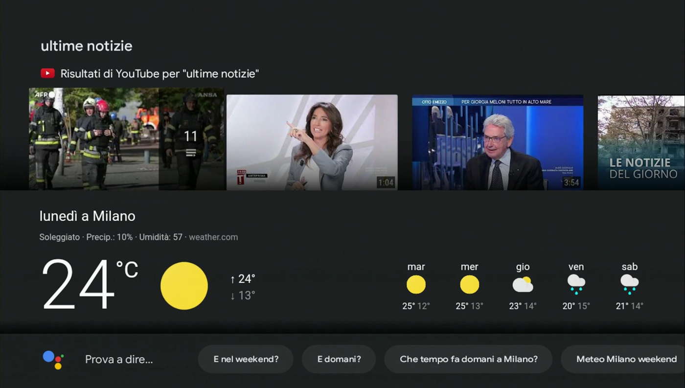 Nella parte superiore destra della Home Screen troviamo l’icona che conduce alle impostazioni di Android, l’orologio e le eventuali notifiche presenti. Sulla sinistra compare invece l’icona Cerca di Google Assistant e la barra di ricerca testuale per trovare film, programmi Tv ed altri contenuti oppure per lanciare le app (Prime Video, YouTube, ecc.) semplicemente pronunciando o digitando il nome, il titolo oppure il genere e la piattaforma da cui trasmette (es.: “fammi vedere She-Hulk su Disney Plus”).