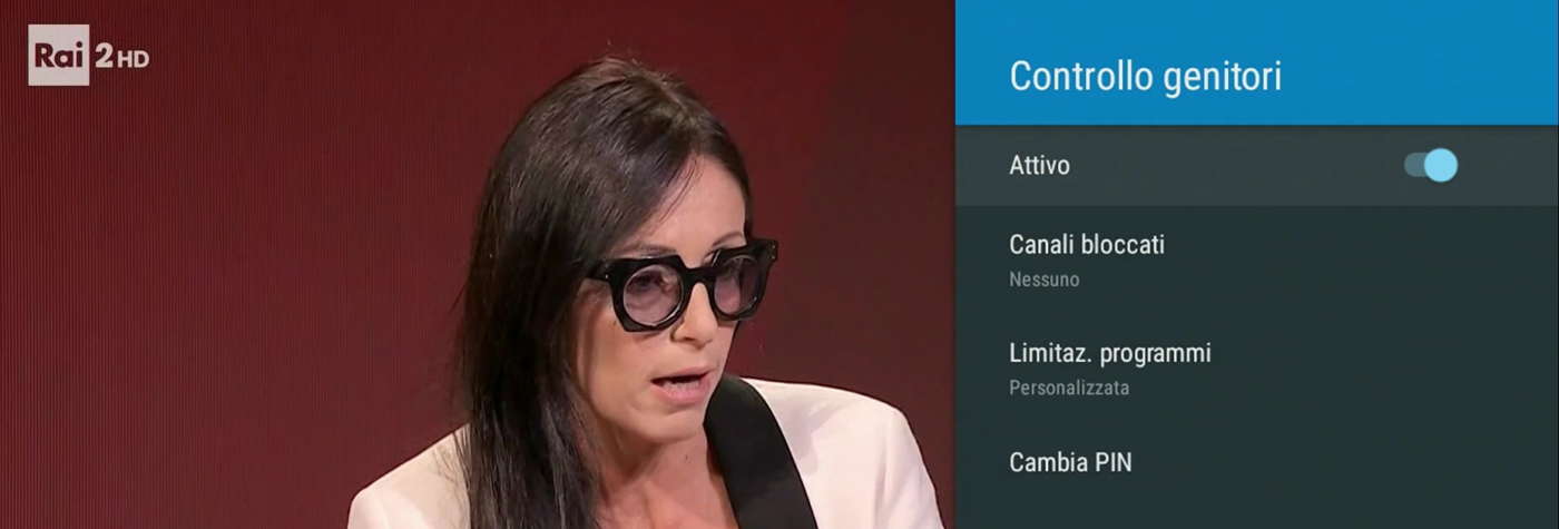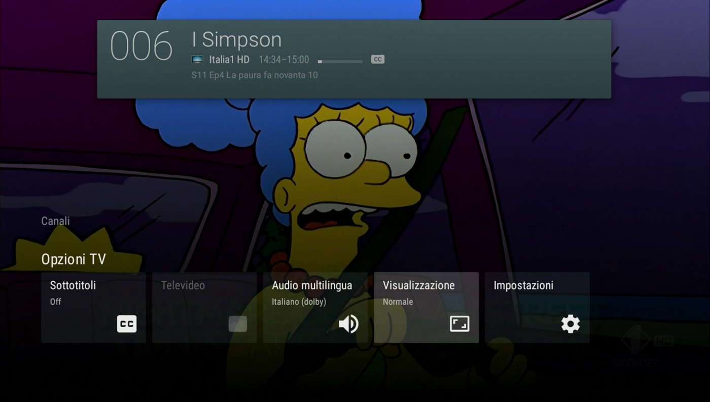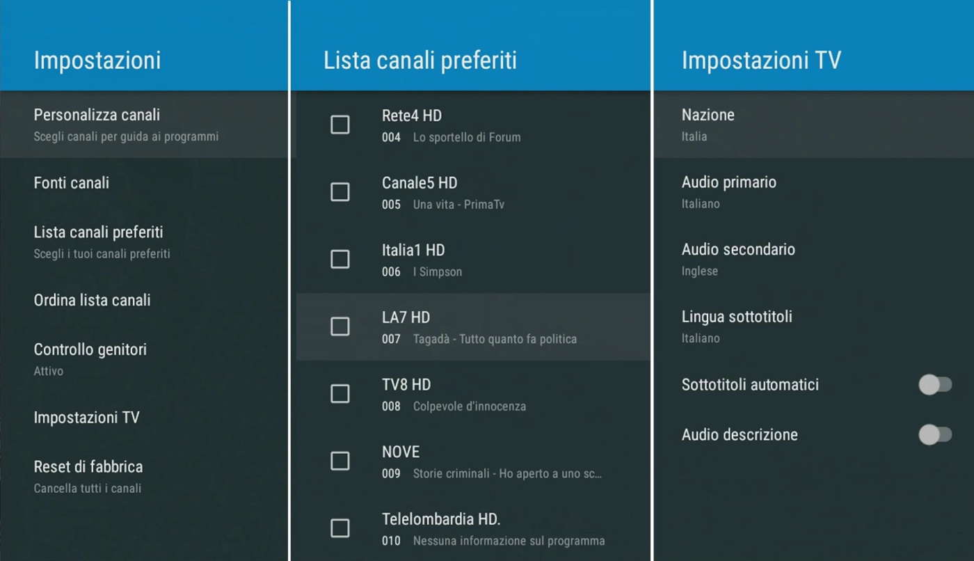 Più in basso troviamo le Opzioni Tv per la scelta dei sottotitoli e delle tracce audio (es.: inglese, lingua originale, Dolby, ecc.), il televideo, la dimensione dell’immagine (normale, intera, zoom) e le impostazioni del tuner DTT (personalizzazione canali EPG, fonti canali, lista canali preferiti, ordinamento canali, Parental Control, lingua audio e sottotitoli primaria e secondaria, sottotitoli automatici, audio-descrizione, reset di fabbrica).