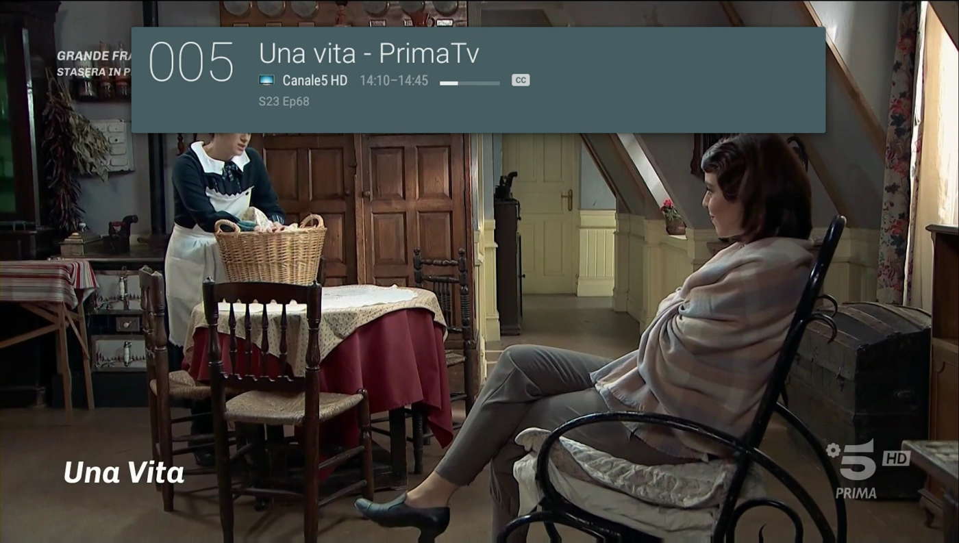 Il banner che appare durante lo zapping contiene le informazioni sul programma in onda e successivo, con gli orari di inizio/fine e la timebar, le tracce audio e gli altri servizi disponibili (es.: sottotitoli CC).