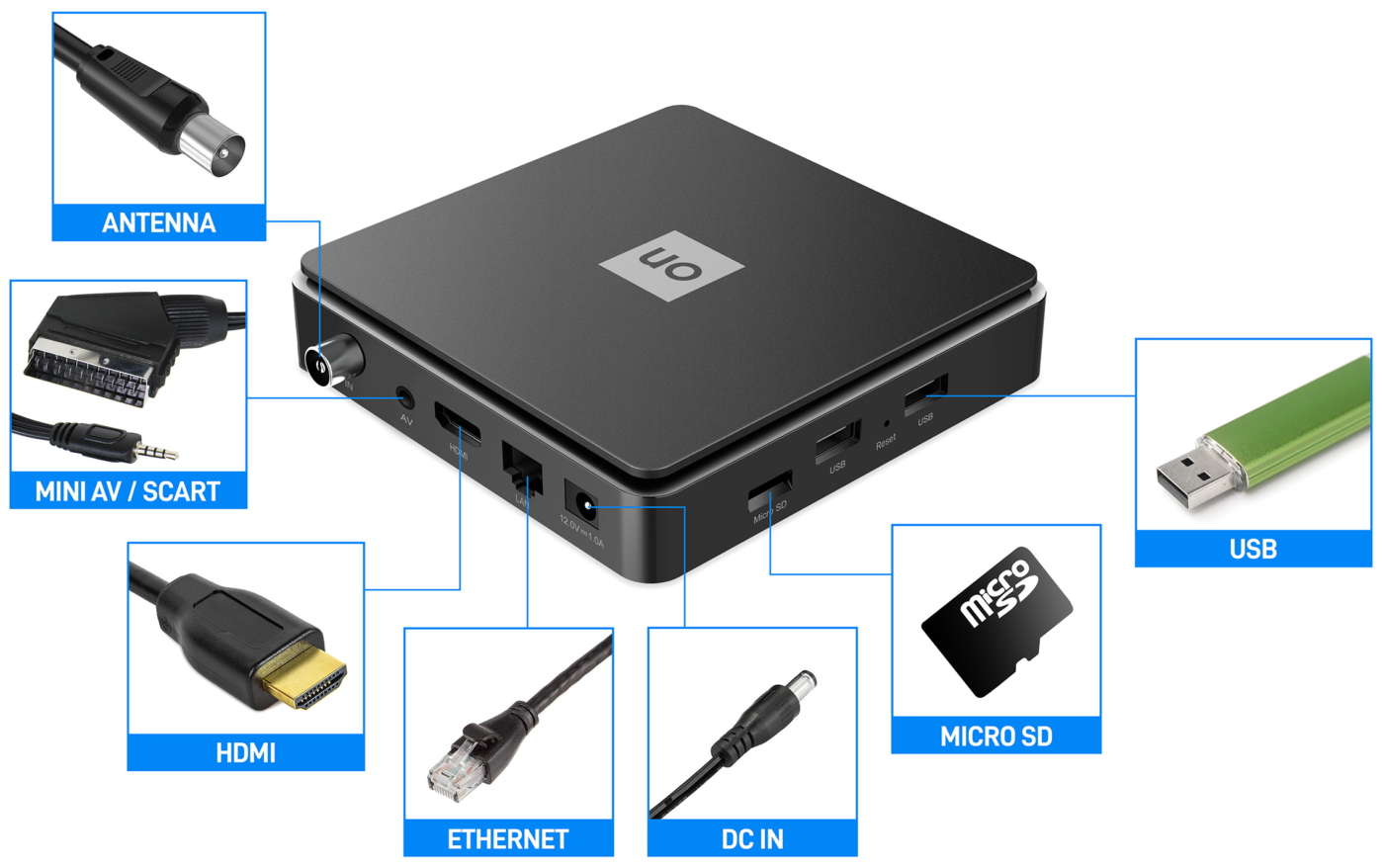Il nuovo SmartBox ON T2 HD rappresenta un’ottima soluzione per tutti coloro che possiedono un vecchio televisore senza applicazioni Smart TV e incompatibile con i futuri standard del digitale terrestre (DVB-T2 e HEVC Main 10).